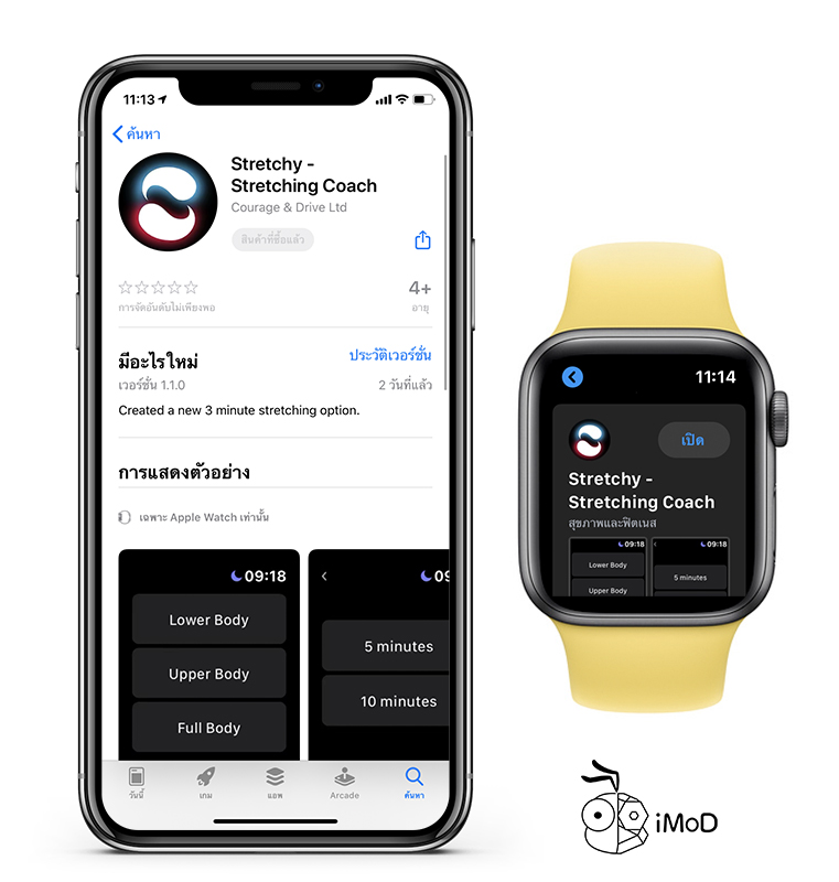 Stretchy เป็นแอป Standalone ที่ใช้งานโดยตรงบน Apple Watch แต่เราก็สามารถดาวน์โหลดบน iPhone [ดาวน์โหลดแอปได้ที่นี่] แล้วให้แอปติดตั้งไปยัง Apple Watch อัตโนมัติได้ หรือใครสะดวกดาวน์โหลดใน App Store บน Apple Watch ก็ค้นหาแอปแล้วดาวน์โหลดได้เลย