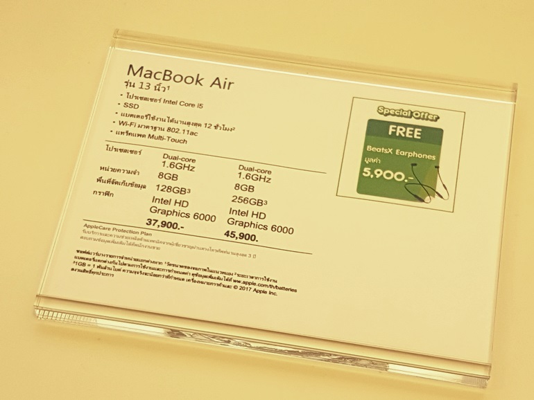 ในเบื้องต้นทีมงานไปสำรวจพื้นที่หน้าร้าน (ลงทุนจัง – -*) ก็พบว่าโปรโมชั่นเป็นจริงดังว่า และโมเดล MacBook Air ก็เป็นตัวปัจจุบันที่ RAM 8 GB ไม่ใช่ตัวเก่า 4 GB แต่อย่างใด แต่น่าเสียดายที่ MacBook Pro โมเดลใหม่ไม่ร่วมรายการ และนอกจากนี้ หากใครไม่สนใจหูฟังก็จะได้รับเป็นส่วนลด 3,000 บาท (จากการสอบถามพนักงาน)