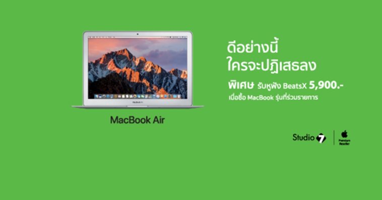 สำหรับคนที่ต้องการซื้อ MacBook Air หรือ Macbook Pro Retina (รุ่นเก่า) ตอนนี้มีข่าวดีมาบอกคือหากคุณไปซื้อที่หน้าร้าน Studio 7 นอกจากจะได้โปรโมชั่นบัตรเครดิตและผ่อน 0% นาน 10 เดือน (หรือมากกว่านี้แล้วแต่บัตร) แถมหูฟัง BeatsX มูลค่า 5,900 บาท