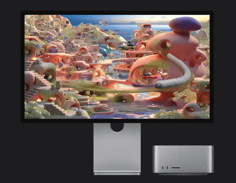 Studio Display ใหม่มาพร้อมจอภาพ Retina 5K ขนาด 27 นิ้ว มีจำนวนพิกเซลมากกว่า 14 ล้านพิกเซล, ความสว่าง 600 นิต และรองรับขอบเขตสีกว้างแบบ P3 เพื่อภาพที่สวยสดสมจริง