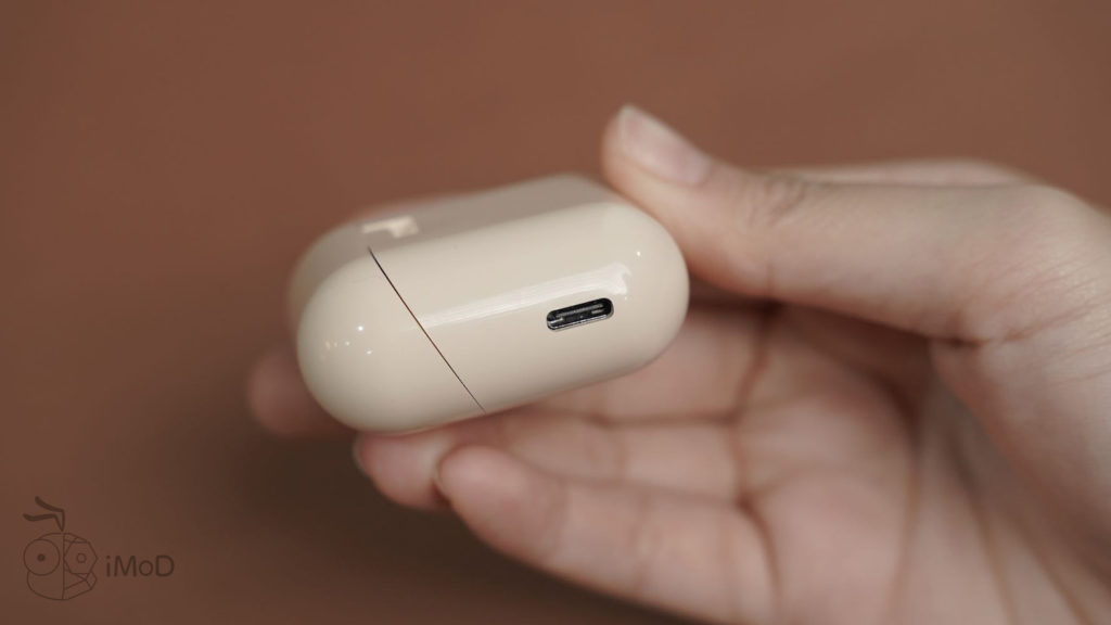 ตัวกล่องชาร์จเป็นแบบสี่เหลี่ยม มีขนาดใกล้เคียงกับเคสของ AirPods ด้านหน้ามีไฟบอกสถานะของแบตเตอรี่กล่องชาร์จ ส่วนด้านข้างเป็นพอร์ต USB-C สำหรับชาร์จกล่อง