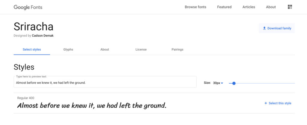 สำหรับการดาวน์โหลดให้แตะลิงก์ [ดาวน์โหลดที่นี่] ที่ทีมงานแนบไว้ด้านหลังชื่อฟอนต์ จากนั้นก็คลิกปุ่ม Download family มุมบนขวาได้เลย