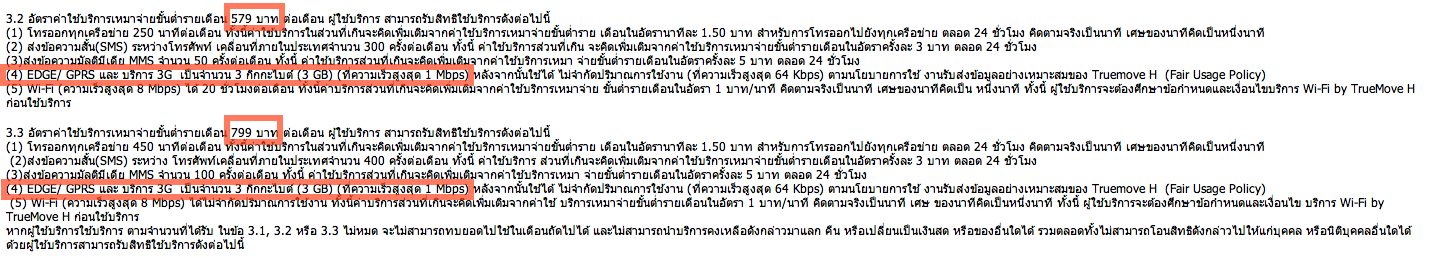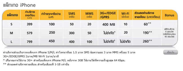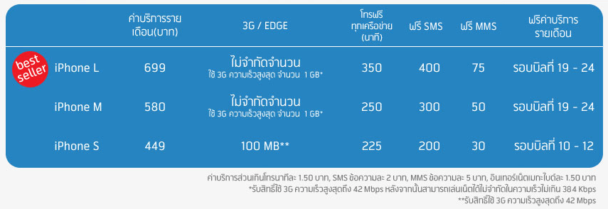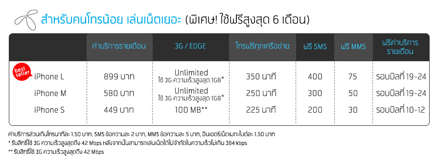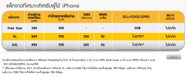 – ความเร็วในการใช้งาน 3G ในแพ็คเกจ S M L ที่มีความเร็วสูงสุดแค่ 1 Mbps ขณะที่แพ็คเกจ Freesize, XL, XXL มีความเร็วสูงสุด 42 Mbps (แต่ตัวเครื่อง iPhone รองรับถึงแค่ 14.4 Mbps)