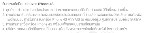 3.ผู้ได้รับสิทธิ์จองจะต้องมีแพ็คเก็จ iPhone S, iPhone M, iPhone L หรือ Super Deal M, Super Deal L หรือสมัครแพ็กเกจเสริมอินเตอร์เน็ตแบบรายเดือน ที่มีมูลค่าตั้งแต่ 650 บาทขึนไป ในวันที่มารับเครื่อง