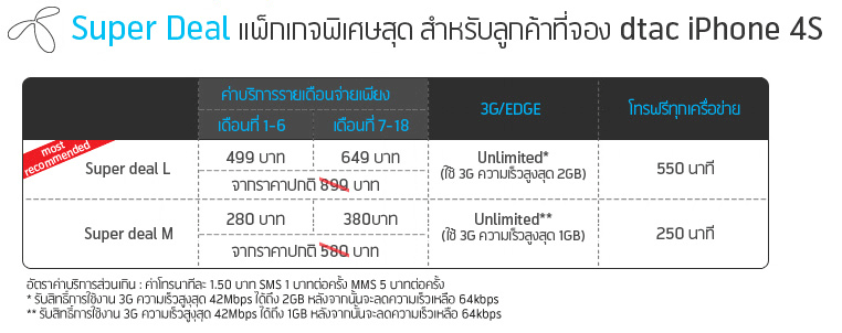4.ในกรณีที่ลูกค้าไม่มีแพ็กเกจแบบรายเดือนตามรายละเอียดในข้อ 3 ลูกค้าจะต้องทำการสมัครแพ็คเก็จแบบรายเดือน iPhone S, iPhone M, iPhone L หรือ Super Deal M, Super Deal L หรือแพ็กเกจเสริมอินเตอร์เน็ตแบบรายเดือน ที่มีมูลค่าตั้งแต่ 650 บาทขึนไป ในวันที่มารับเครื่อง (ต้องซื้อพร้อมแพ็คเกจนั่นเอง)