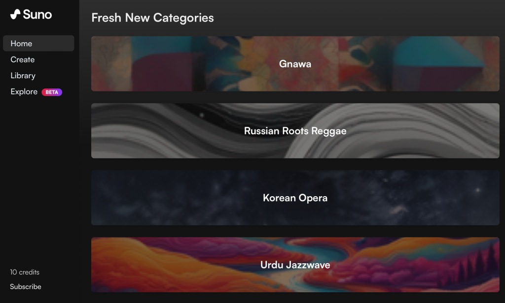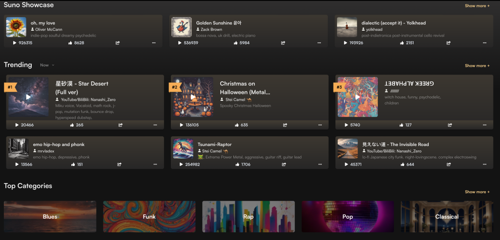 เราสามารถเข้าไปสํารวจเพลงที่ดีที่สุดจากชุมชนได้ง่ายขึ้น มีหมวดหมู่เพลงแบบไดนามิกหลากหลายรูปแบบใหม่ๆลงในหน้าแรก ที่ได้รับความนิยมและชอบ และเราสามารถฟังเพลง หรือสร้างเพลย์ลิสต์ที่เราชอบ บน Suno ได้ ขอให้สนุกกับสร้างเสียงดนตรี จาก Ai นะคะ