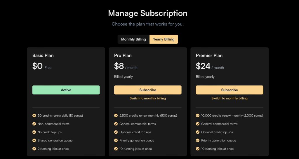 Suno มีแพ็คเกจให้เลือกใช้ทั้งแบบฟรีและแบบเสียค่าใช้จ่าย แพ็คเกจฟรีอนุญาตให้สร้างสรรค์ดนตรี แต่มีข้อจำกัดในการนำไปใช้เพื่อการค้า ส่วนแพ็คเกจ Pro แบบเสียค่าใช้จ่าย เริ่มต้นที่ 296.32บาท/เดือน อนุญาตให้ผู้ใช้มีสิทธิ์ทางการค้า กับผลงานเพลงที่สร้างสรรค์ด้วย AI สามารถนำไปใช้ในโปรเจคต่างๆ ได้อย่างอิสระ เช่น วิดีโอ เกม และโฆษณา