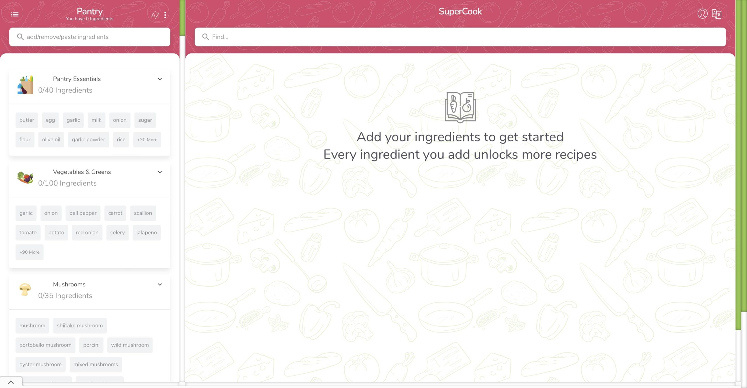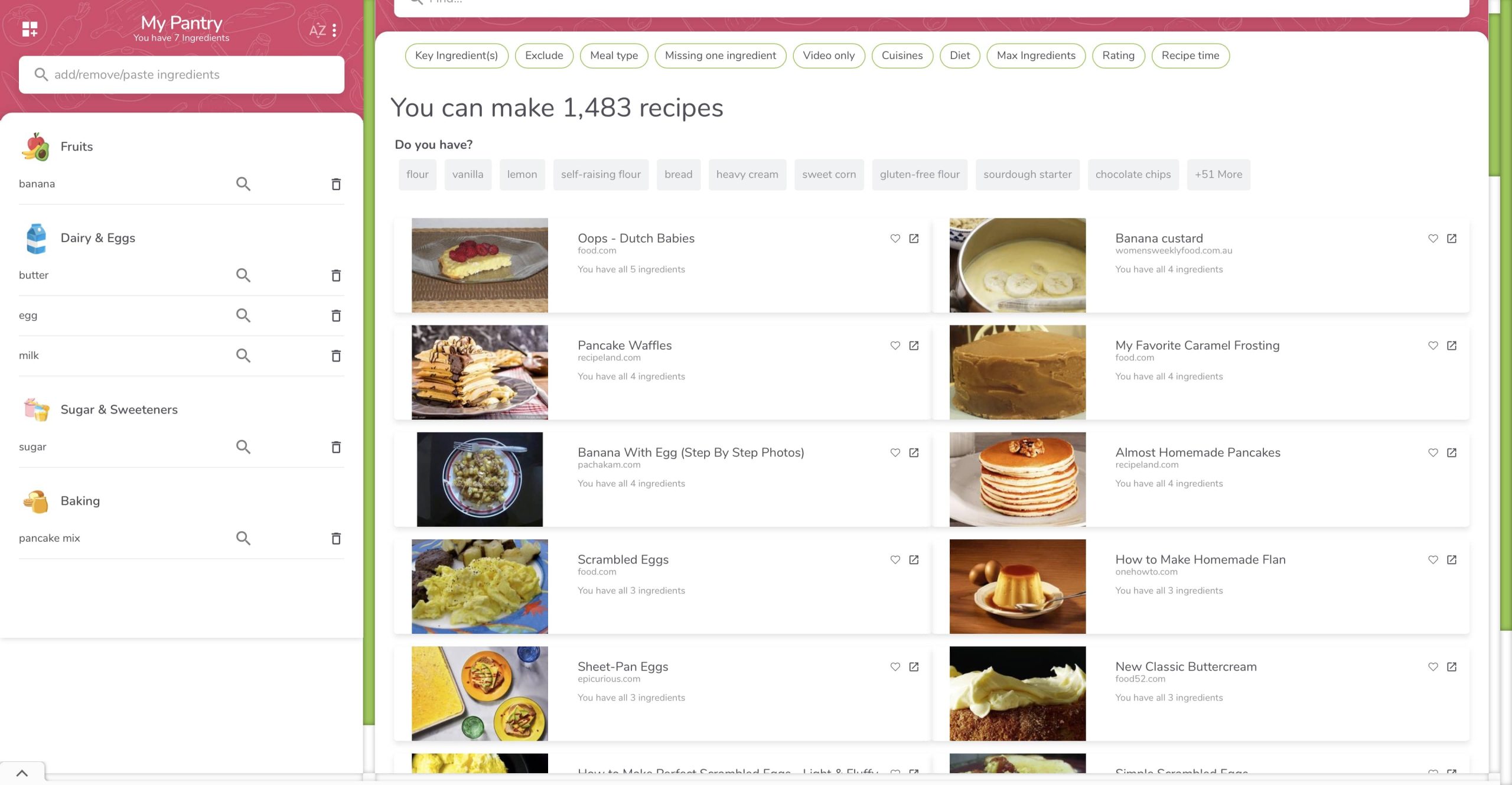 พอเราใส่ส่วนผสมไปแล้วจะมีสูตรอาหารมากมายที่ใช้ส่วนผสมที่เรามีทำได้เลย หรือจะเป้นแพนเค้กที่เราอยากทำก็จะสูตรเหมือนกัน โดยที่ตรง Pantry จะขึ้นส่วนผสมที่เราเลือกทั้งหมด โดยเราสามารถแก้ไขส่วนผสมและอาหารที่ต้องการทำโดยการกดตรง 3 ขีดด้านบนมุมซ้าย