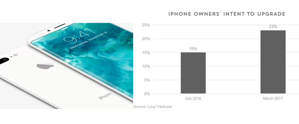 ผลสำรวจจากผู้ใช้ iPhone ในสหรัฐอเมริกาจำนวนมากกว่า 500 ราย พบว่า 23% ของผู้ใช้ iPhone สนใจที่จะอัปเกรดเป็น iPhone 8 มากกว่าผลสำรวจเมื่อปีที่แล้วที่มีผู้ใช้ 15% สนใจอัปเกรดเป็น iPhone 7