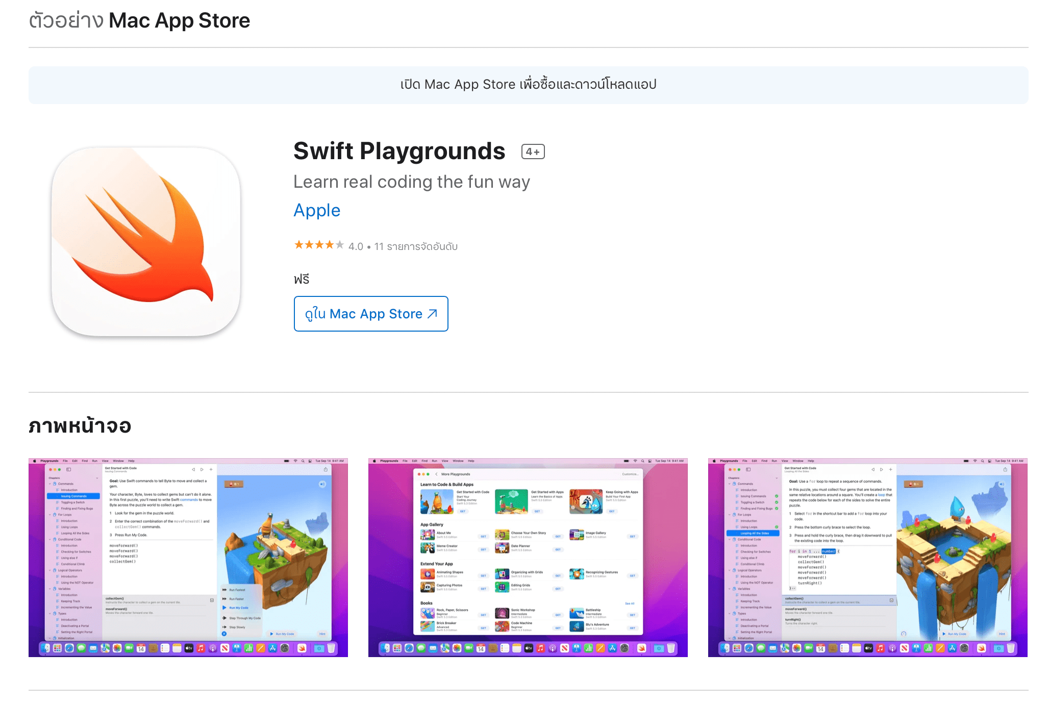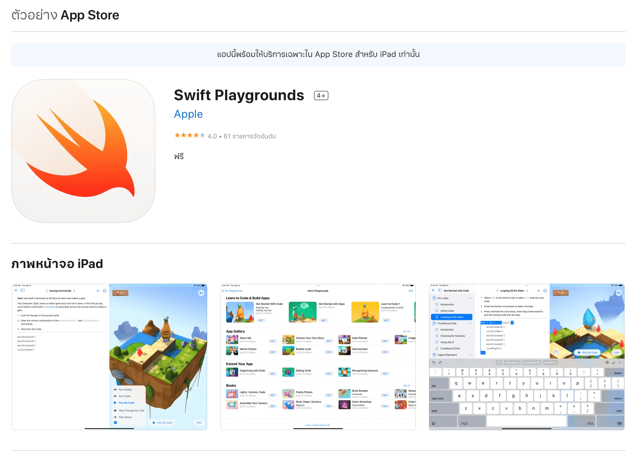 Swift Playgrounds เป็นแอปสำหรับ iPad และ Mac ที่ช่วยสอนการเขียนโค้ด Swift ด้วยวิธีแบบง่าย ไม่มีพื้นฐานการเขียนโค้ดก็สามารถพัฒนาแอปได้
