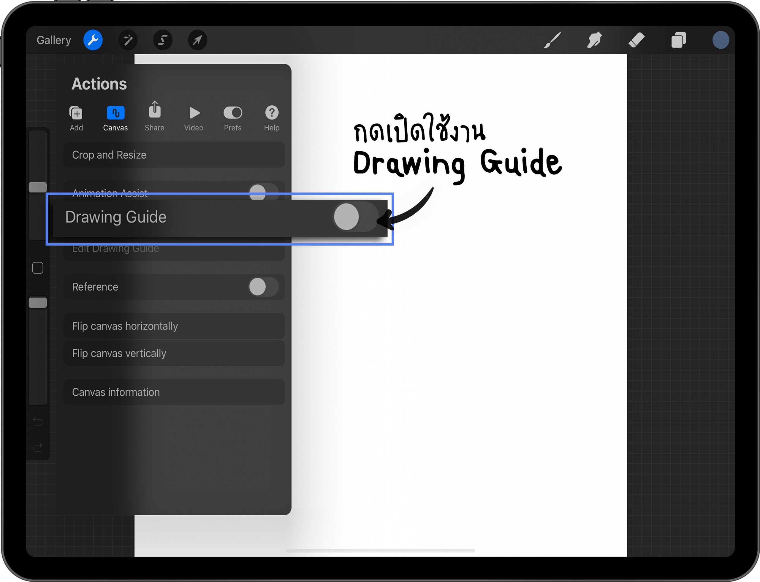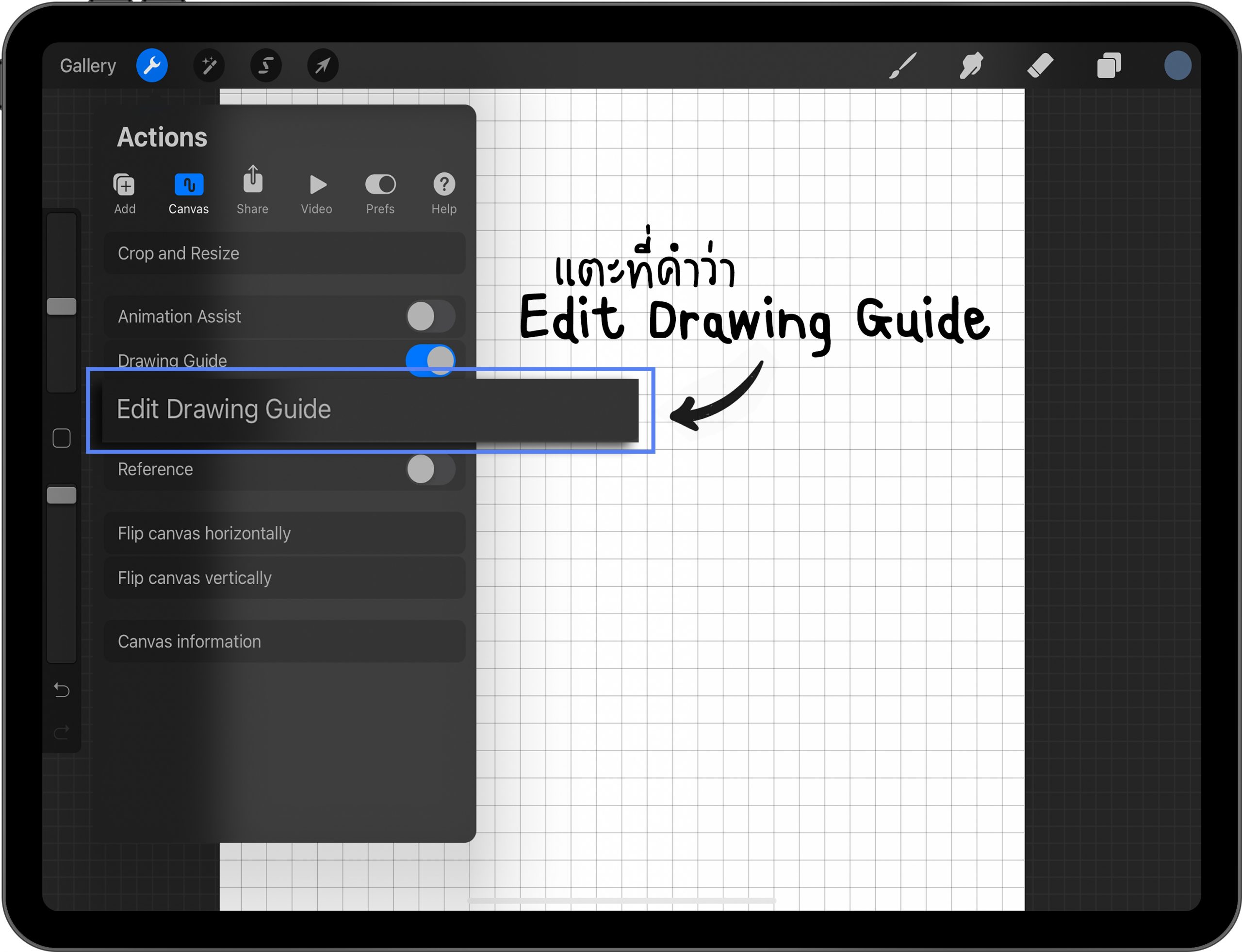 กดที่รูปเครื่องมือ > Canvas > เปิดใช้งาน Drawing Guide > แตะที่คำว่า Edit Drawing Guide