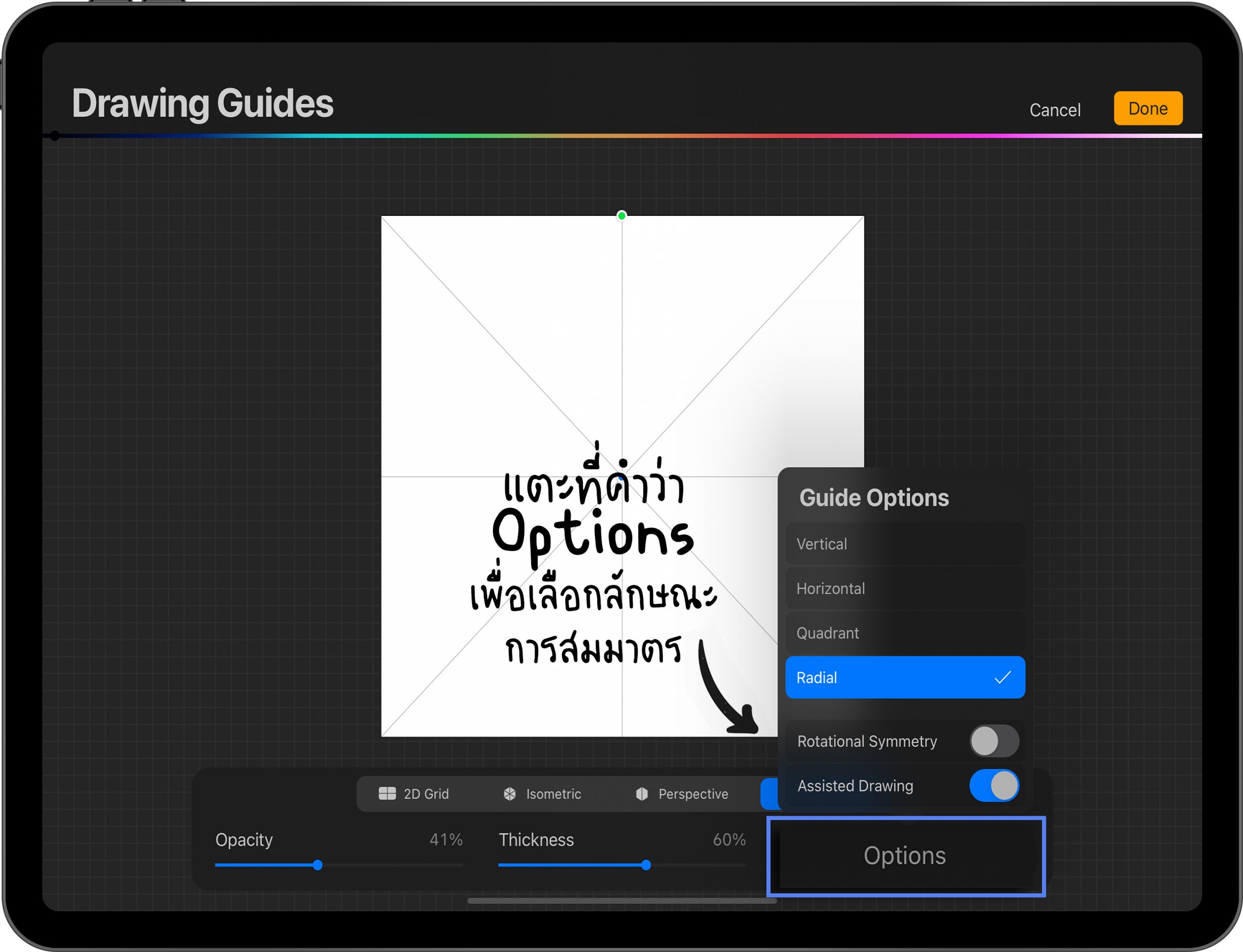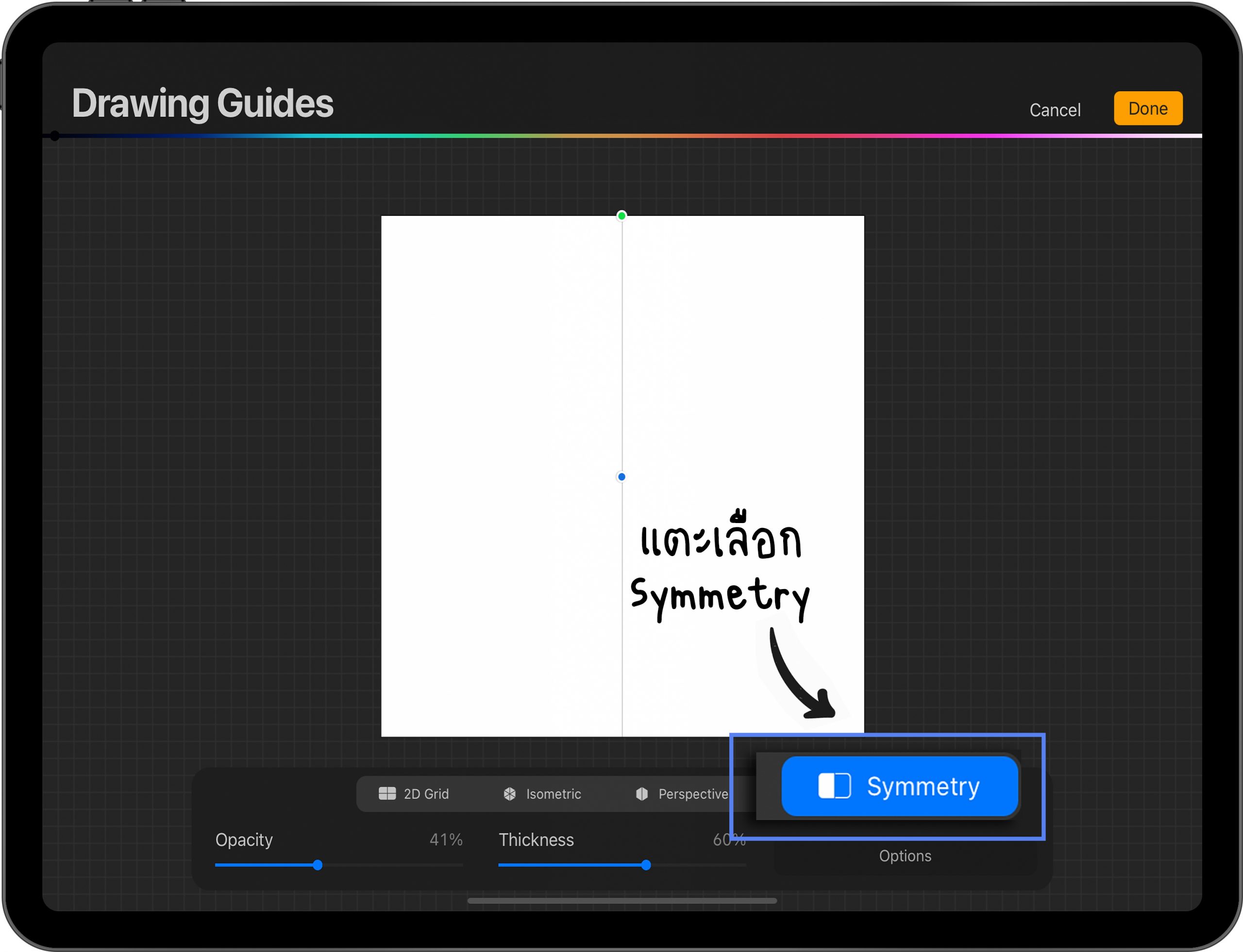 วิธีการเปิดใช้งาน แตะคำว่า Symmetry > แตะ Options > เลือกลักษณะการสมมาตร > กด Done มุมขวาบน