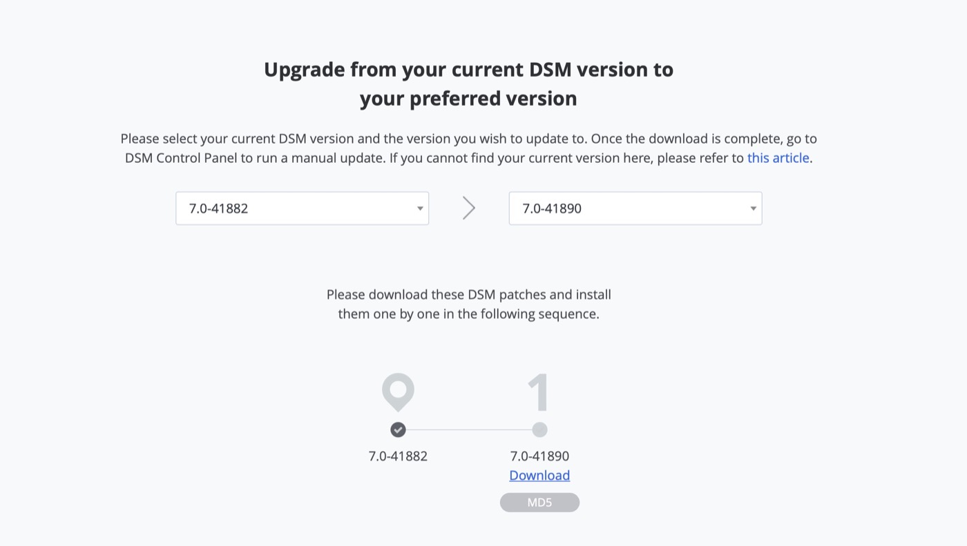 หากอุปกรณ์ตรวจไม่พบเวอร์ชันใหม่สามารถดาวน์โหลดไฟล์อัปเดตได้ที่ https://www.synology.com/en-global/support/download