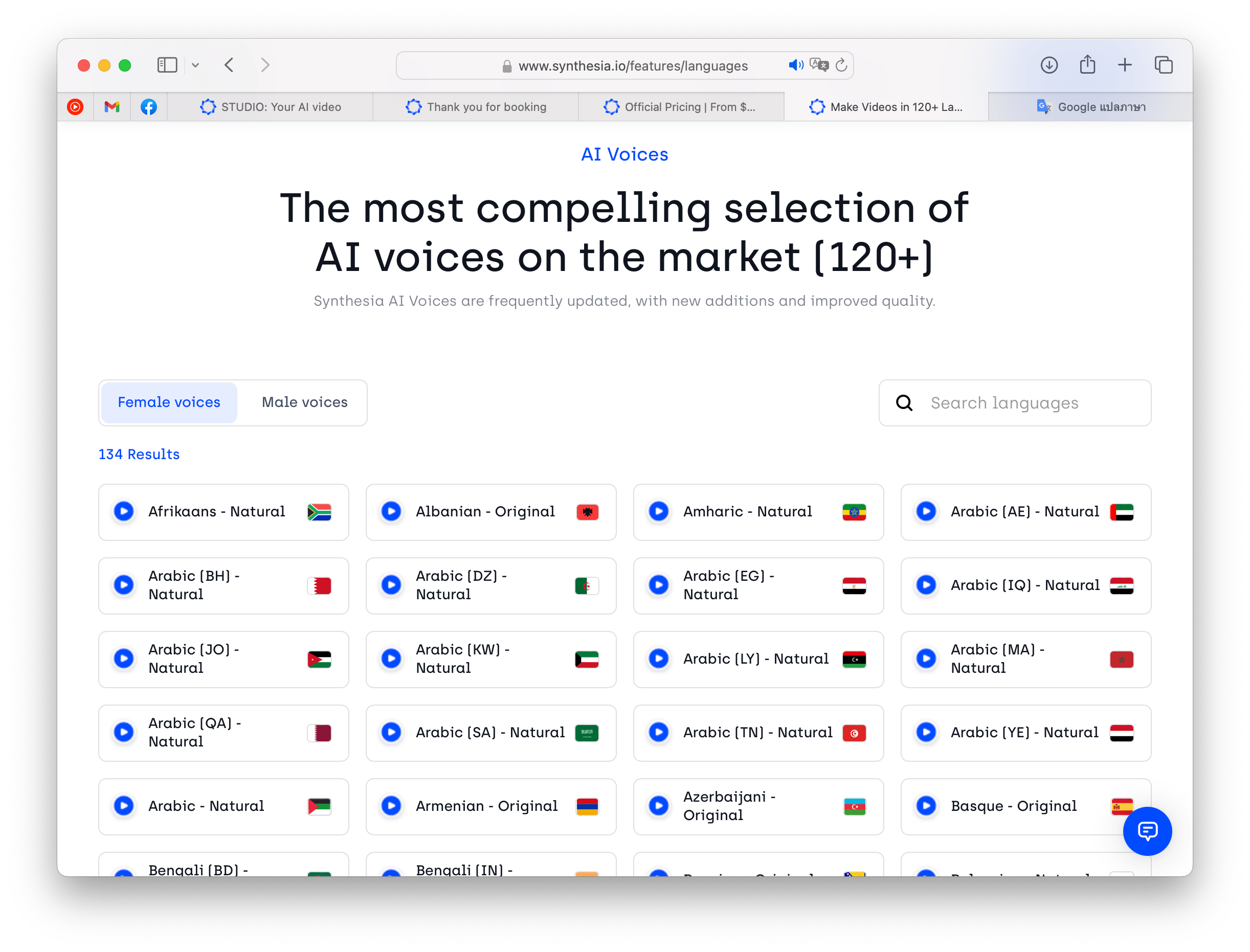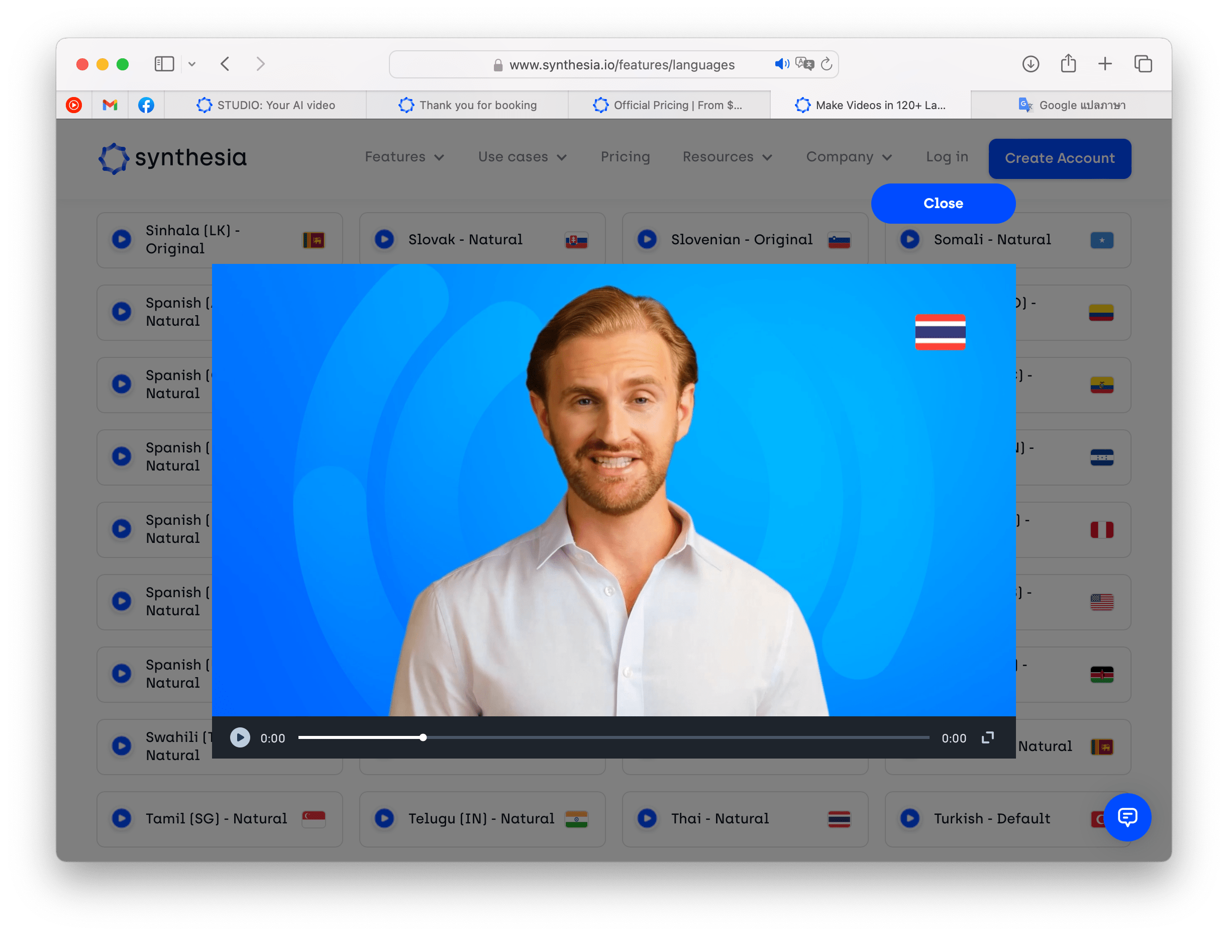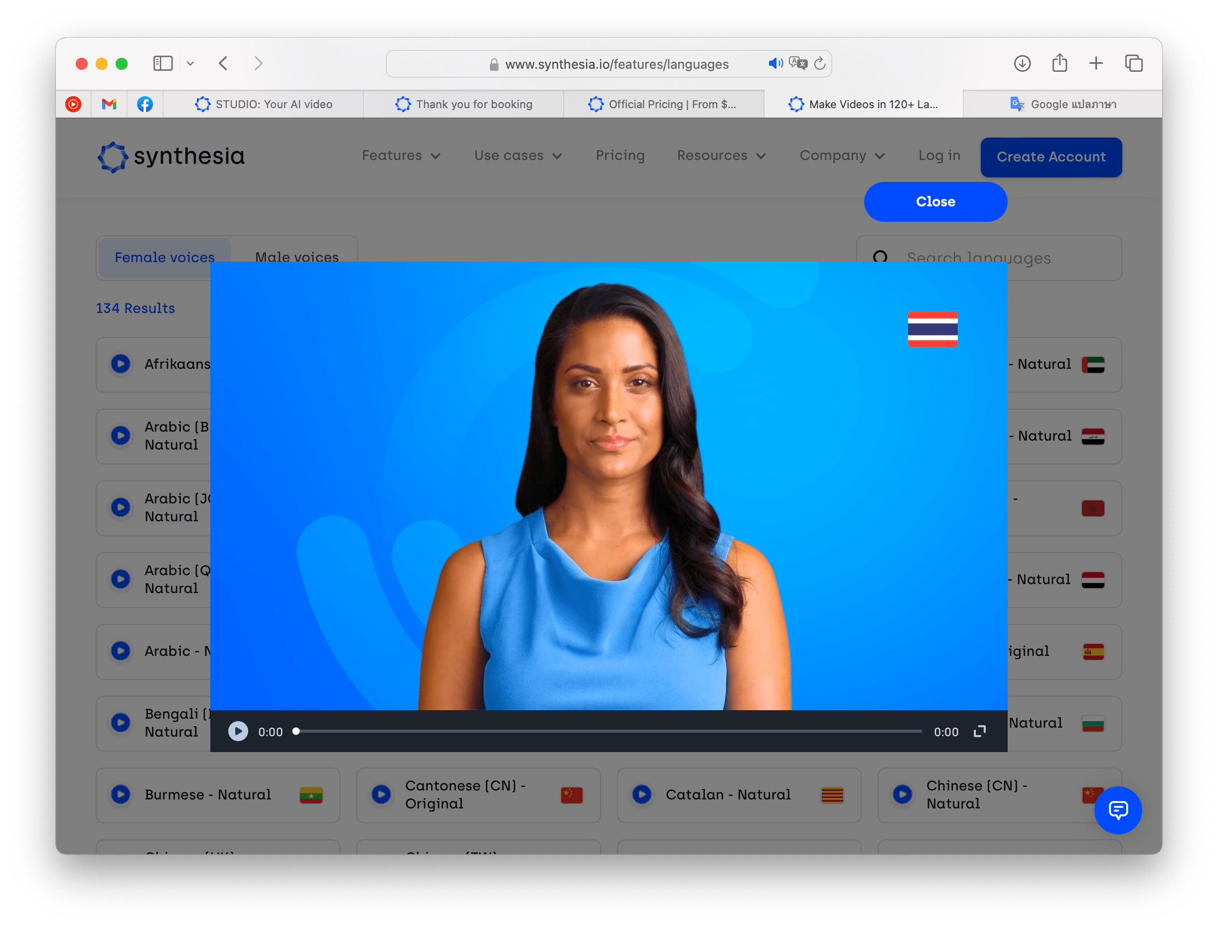 Synthesia.io สามารถเลือกภาษาในการนำเสนอได้ รวมถึงเสียงพูดทั้งแบบผู้หญิงและผู้ชาย และที่สำคัญคือรองรับภาษาไทยด้วย