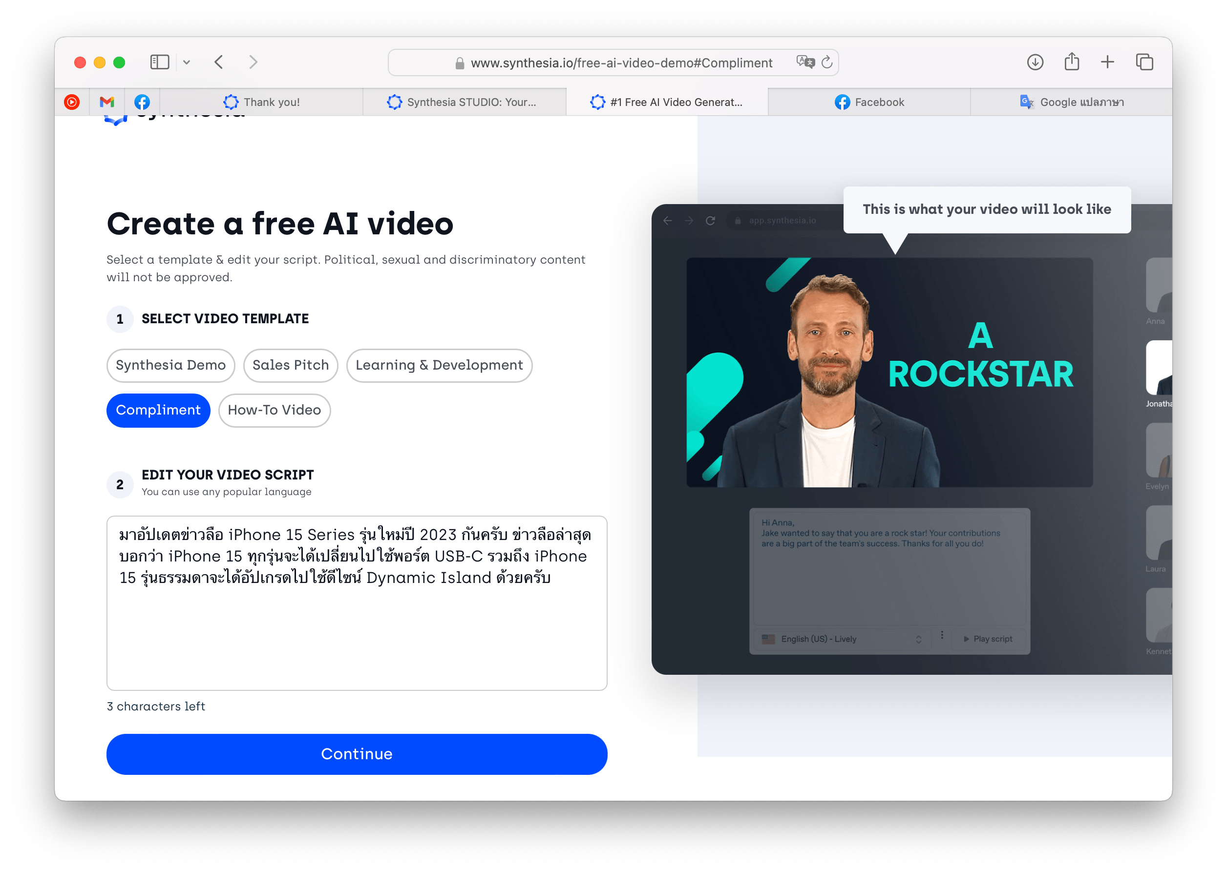 จากนั้นคลิกที่ “Continue” > กรอกข้อมูล > คลิก “Generate Free Video”