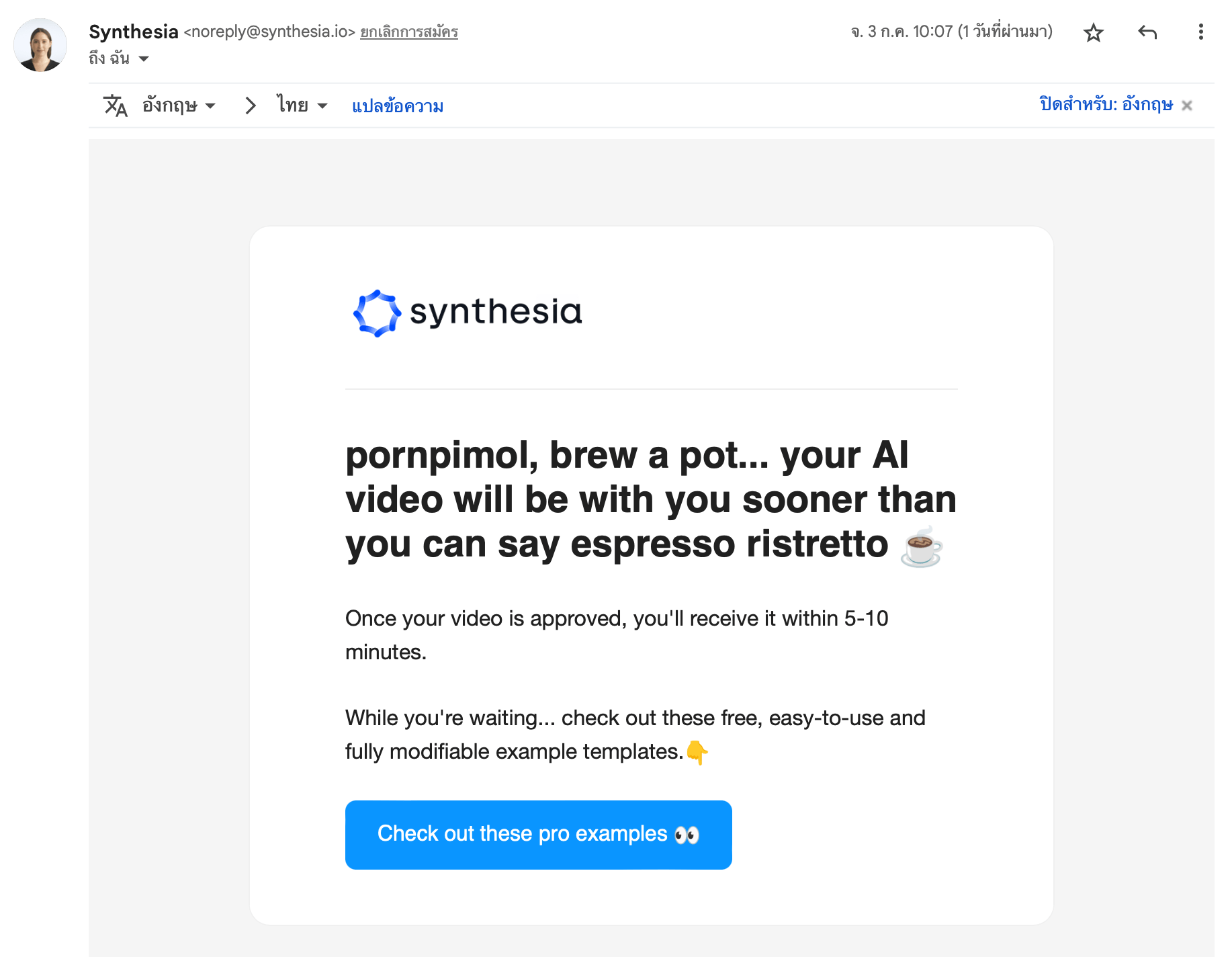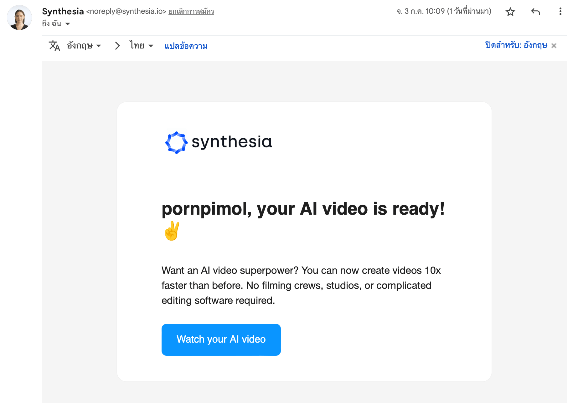 ส่วนอีกเมลนึงเป็นวิดีโอที่เราสร้างขึ้นจาก AI ให้คลิกที่ “Watch your AI Video”