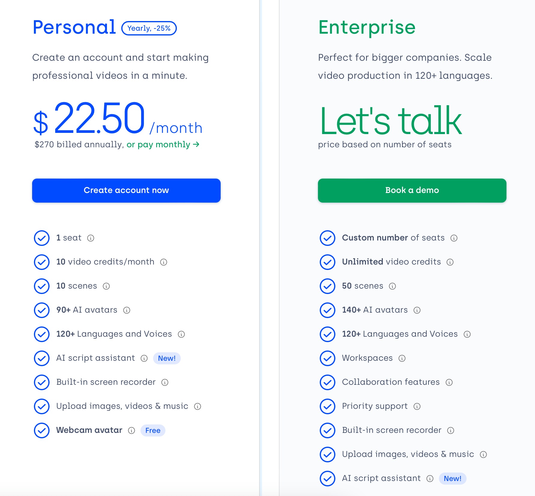 ส่วนใครที่อยากปรับแต่งเสียง, ภาษา, Avatars หรือภาพประกอบวิดีโอเพิ่มเติมก็สามารถคลิกที่ “Create Synythesia account” ได้เลย โดยจะต้องสร้าง account ในรูปแบบของการสมัครสมาชิกเป็นแบบรายเดือนหรือรายปี นอกจากนี้ก็ยังสามารถสมัครในนามองค์กรได้ด้วย ลองเข้าไปเล่นกันดูนะคะ