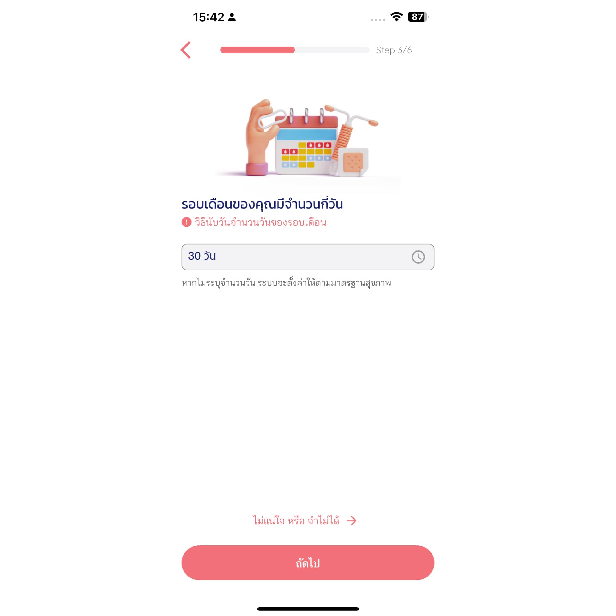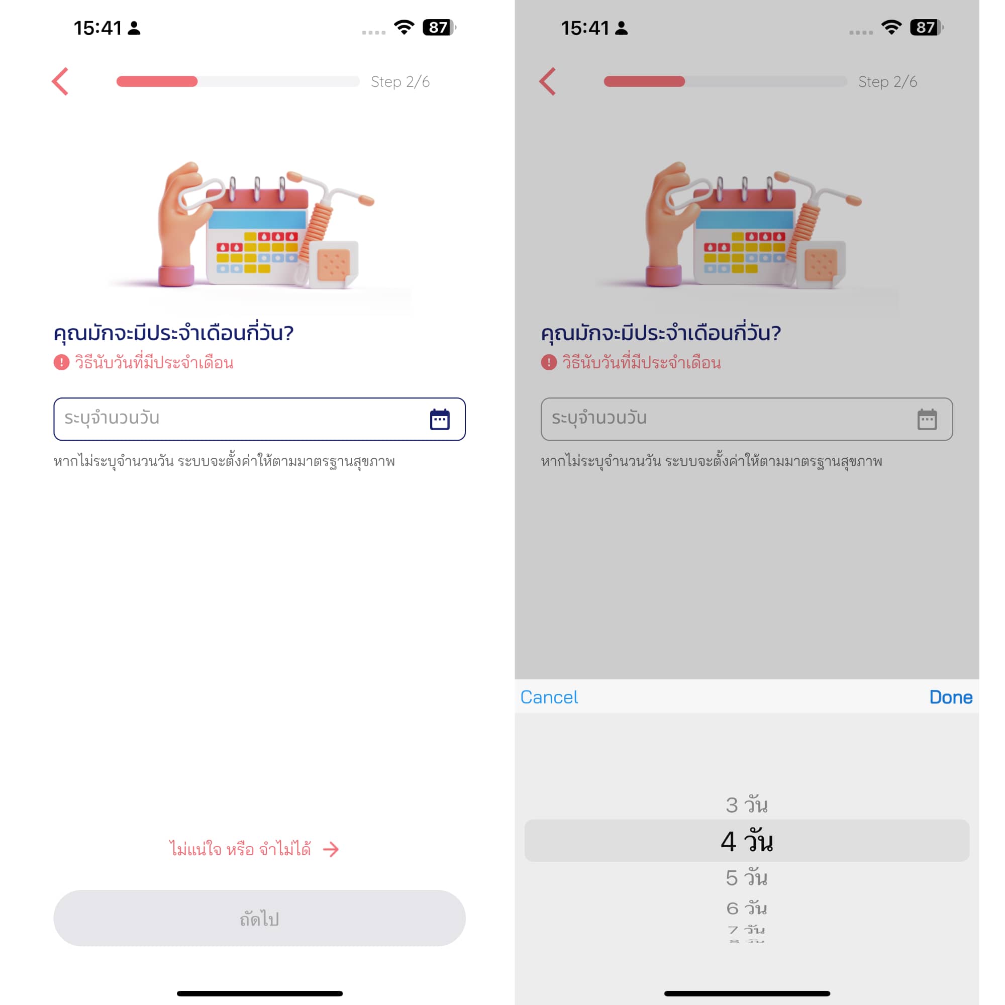 ตัวแอปก็จะถามคำถามต่าง ๆ เกี่ยวกับประจำเดือนของเรา เช่น คุณมักจะมีประจำเดือนกี่วัน
