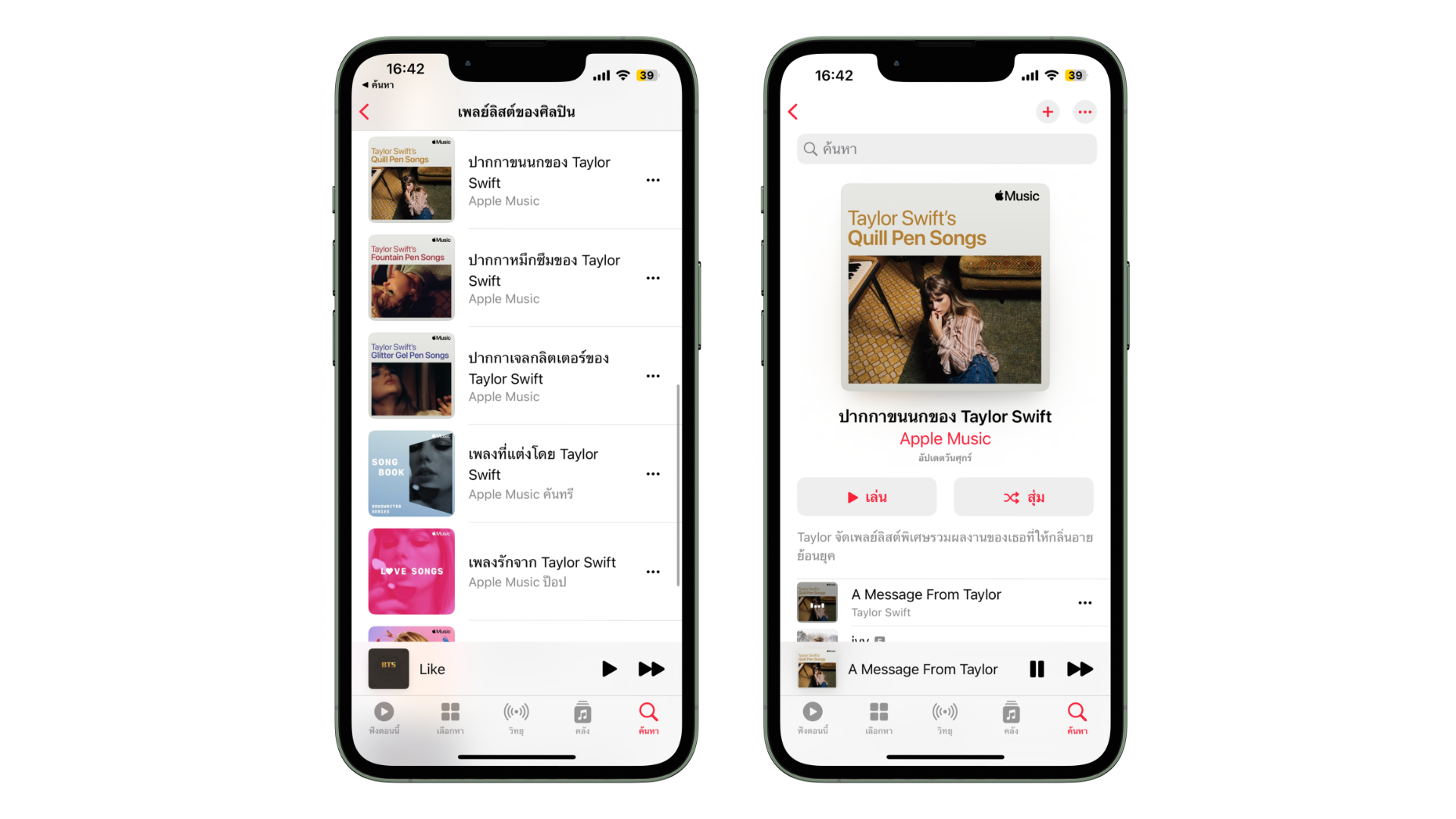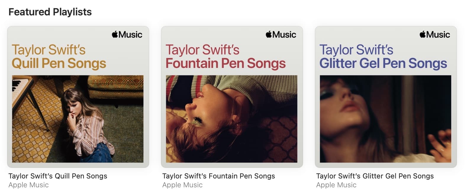 และวันนี้เธอก็ได้นำระบบเดียวกันนี้มาสร้าง 3 เพลย์ลิสต์บน Apple Music ที่เธอเลือกเองกับมือ โดยแต่ละเพลงถูกเลือกตามหมวดของเนื้อเพลงและคลิปเสียงพิเศษจากตัวเธอเองด้วย: ปากกาหมึกซึมของ Taylor Swift, ปากกาเจลกลิตเตอร์ของ Taylor Swift และ ปากกาขนนกของ Taylor Swift