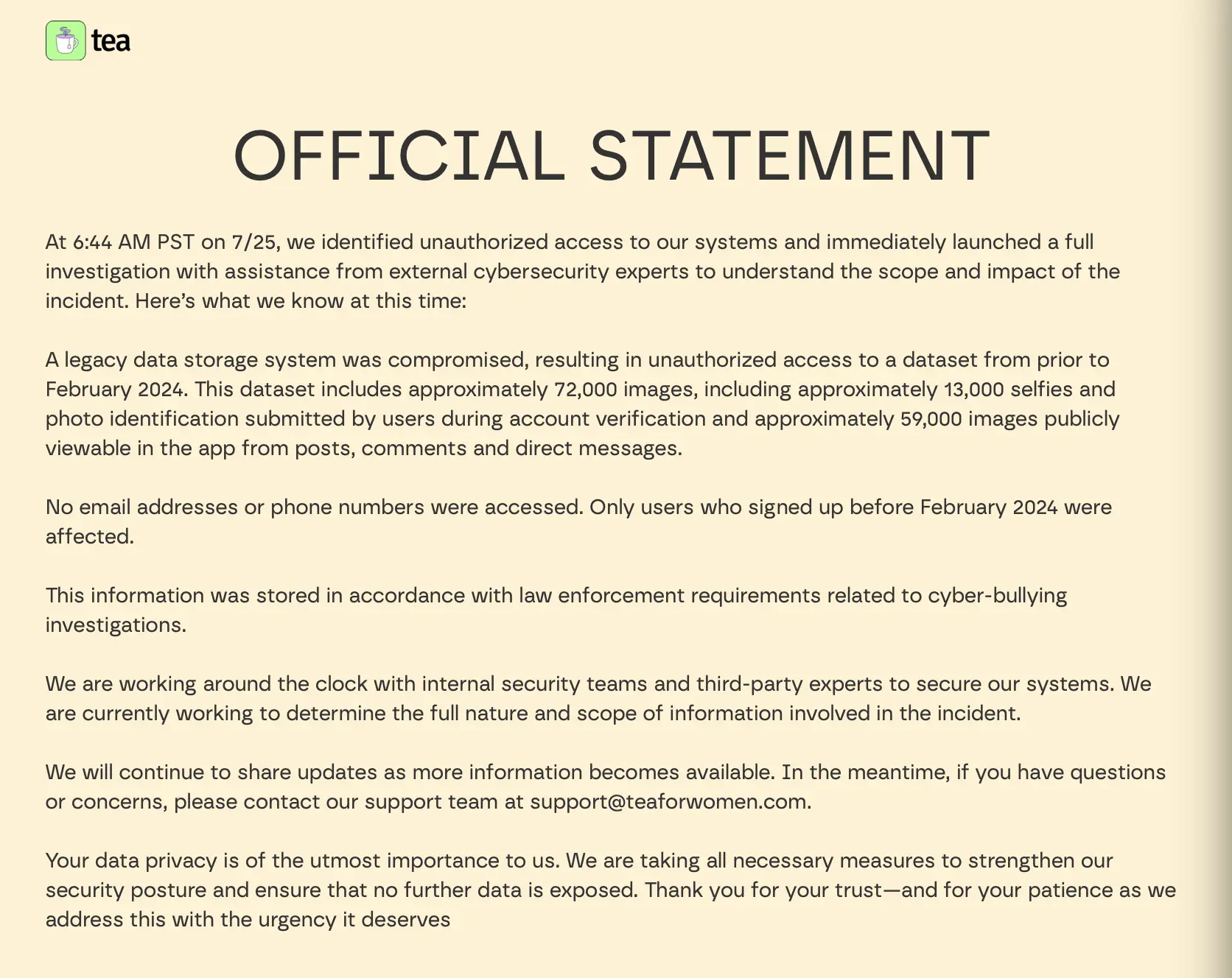 โฆษกของ Tea ยืนยันการถูกแฮ็กเมื่อวันศุกร์ที่ผ่านมา (25 ก.ค. 2025) โดยระบุว่ามีภาพรวมกว่า 72,000 รูป และในจำนวนนั้นมีอย่างน้อย 13,000 รูปเป็นภาพการยืนยันตัวตนและภาพบัตรประจำตัวประชาชนของผู้ใช้งานที่ถูกเข้าถึงโดยไม่ได้รับอนุญาต
