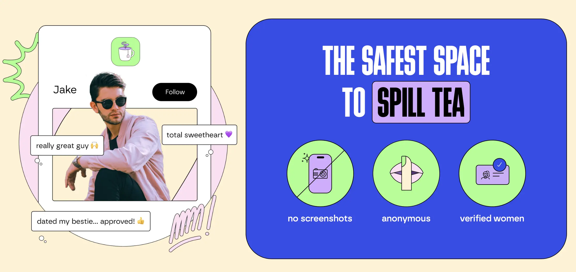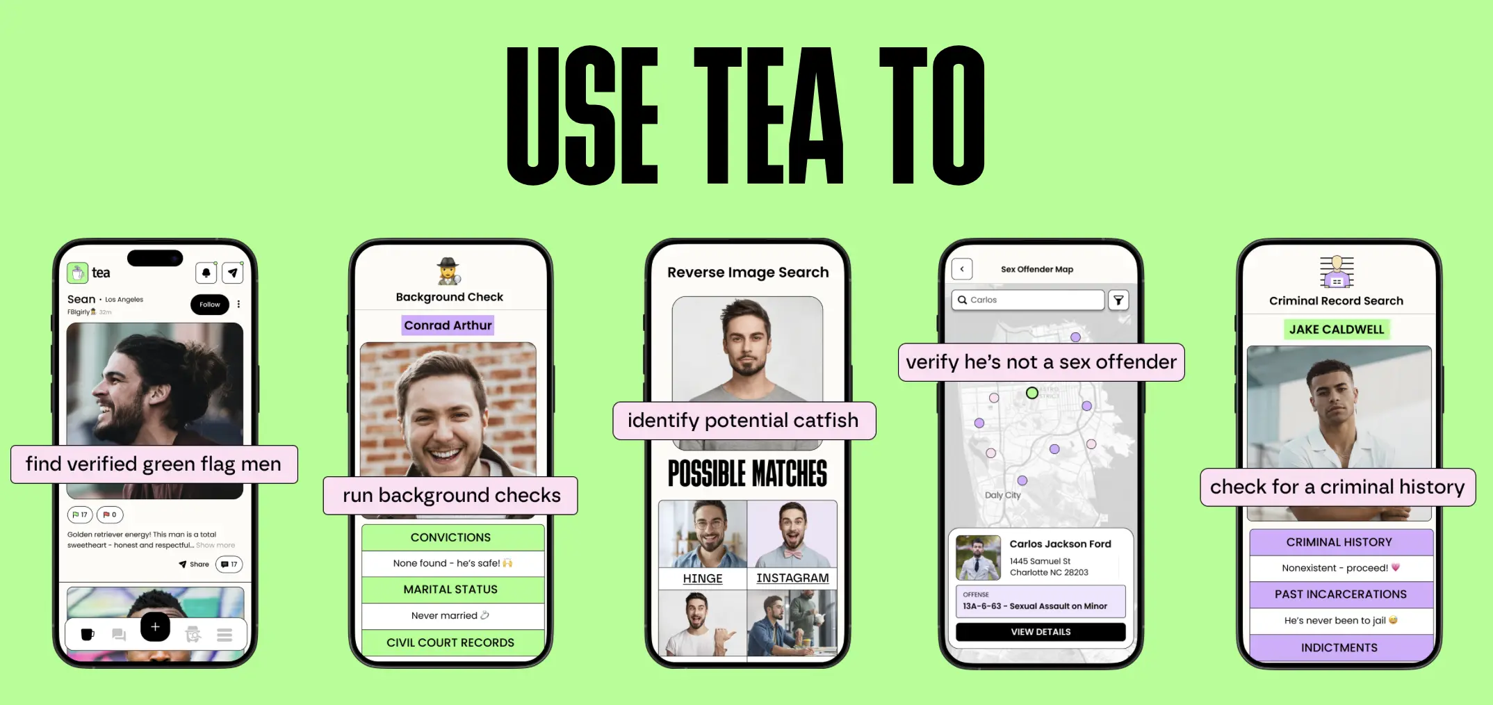 Tea ถูกสร้างขึ้นให้เป็นเครือข่ายสำหรับผู้หญิงโดยให้ผู้ใช้อัปโหลดภาพถ่ายของผู้ชาย และค้นหาข้อมูลตามชื่อ พร้อมให้ความคิดเห็นว่าเป็น “ธงแดง” หรือ “ธงเขียว” และแลกเปลี่ยนข้อมูลอื่น ๆ เกี่ยวกับบุคคลนั้น