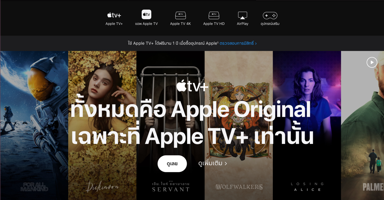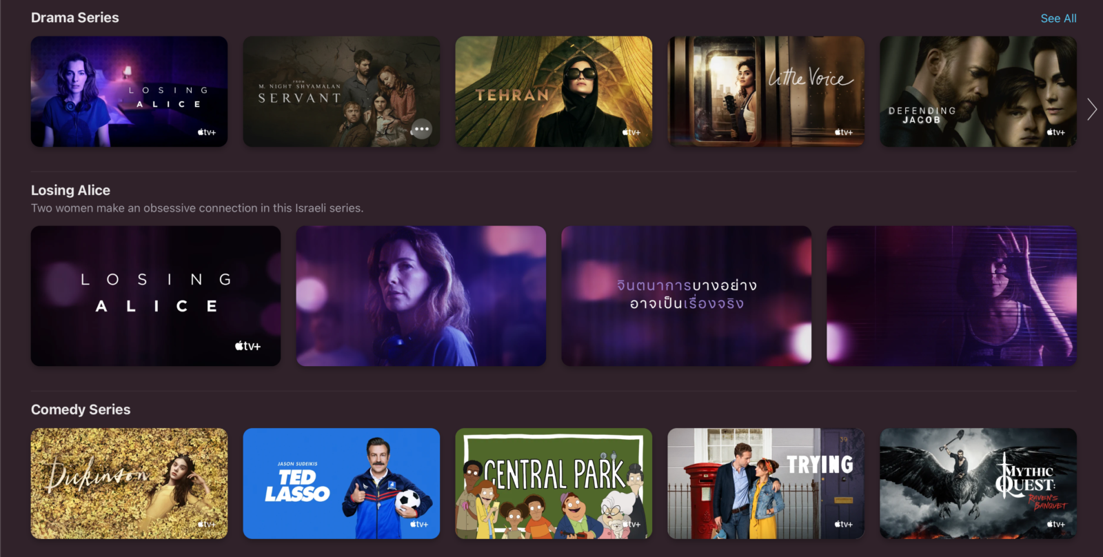 Apple TV+ เป็นแหล่งรวมผลงานต้นฉบับจาก Apple ที่สร้างสรรค์โดยจินตนาการอันเป็นเลิศของสุดยอดนักเล่าเรื่องแห่งยุค พร้อมยังชนะรางวัลมาแล้วมากมาย Apple TV+ นำเสนอเนื้อหาคุณภาพระดับพรีเมียม ไม่ว่าจะเป็นซีรีส์แนวคอมเมดี้หรือดราม่า ภาพยนตร์ ภาพยนตร์สารคดีสุดล้ำ หรือเนื้อหาบันเทิงสำหรับเด็กและครอบครัว