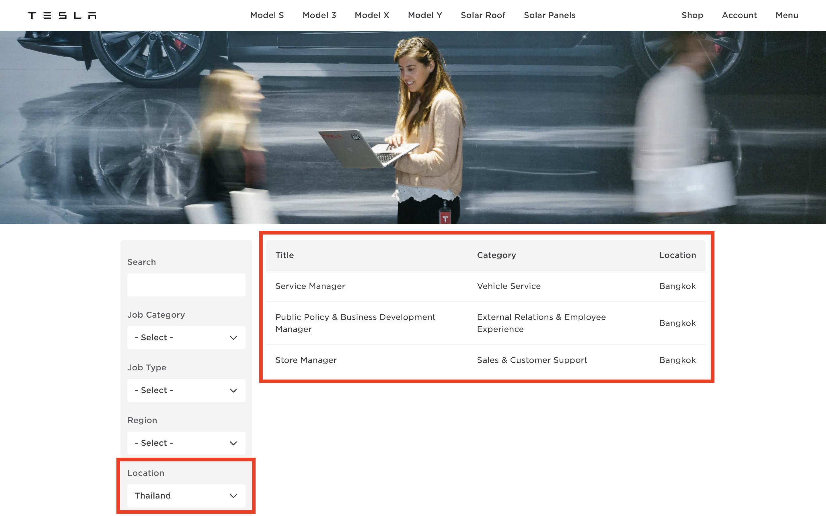 รวมถึงยังมีอีกหนึ่งเบาะแสจากเว็บไซต์ Career ของ Tesla ที่ประกาศรับสมัครพนักงาน โดยในเมนูตัวเลือกประเทศที่ Tesla เข้าไปทำตลาดนั้นก็ปรากฏประเทศไทยแล้ว แต่ยังไม่มีรายละเอียดการรับสมัครในตำแหน่งต่าง ๆ