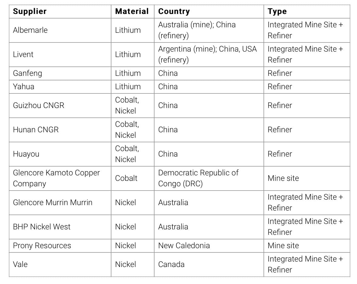 ก่อนหน้านี้ Tesla ก็ได้เปิดเผยรายชื่อเหมือง 9 แห่งที่เป็นผู้ขุดหาแร่ธาตุโดยตรงให้ Tesla โดยเหมืองส่วนใหญ่ตั้งอยู่ในประเทศจีน และลือกันว่า Tesla ได้ทำข้อตกลงลับกับเหมือง Vale ในแคนนาดา ซึ่งเป็นเหมืองนิกเกิลที่ใหญ่ที่สุดในโลกอีกด้วย