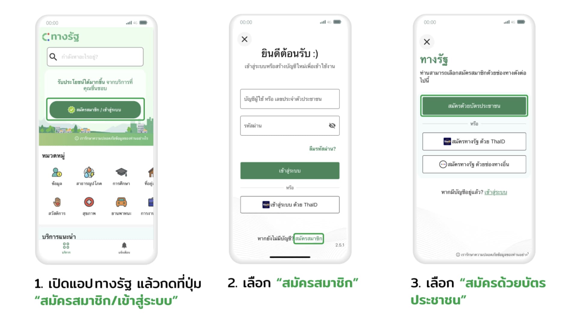 เปิดแอป “ทางรัฐ” ขึ้นมา > หากคุณมีแอป ThaID อยู่แล้ว สามารถยืนยันตัวตันผ่านแอปนั้นได้เลย แต่หากไม่มี ให้เลือก สมัครสมาชิก > เลือก “สมัครด้วยบัตรประชาชน”