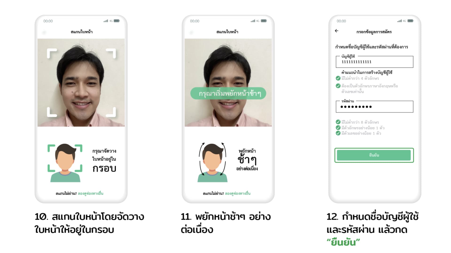 จัดวางใบหน้าจองคุณให้อยู่ในกรอบ และเริ่มพยักหน้าช้า ๆ เมื่อเสร็จแล้ว ให้กำหนดชื่อบัญชีผู้ใช้ และรหัสผ่านของคุณเอง พอเสร็จแล้วกด “ยืนยัน”