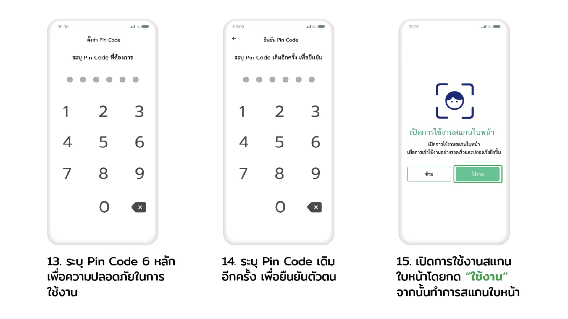 ตั้ง PIN หรือรหัสผ่าน 6 หลัก ของคุณ และใส่รหัสอีกครั้งเพื่อยืนยัน > เปิดใช้งานการสแกนใบหน้า เพื่อครั้งต่อไปจะได้ไม่ต้องใส่รหัสผ่าน ใช้การสแกนใบหน้าจากกล้องหน้ามือถือแทน