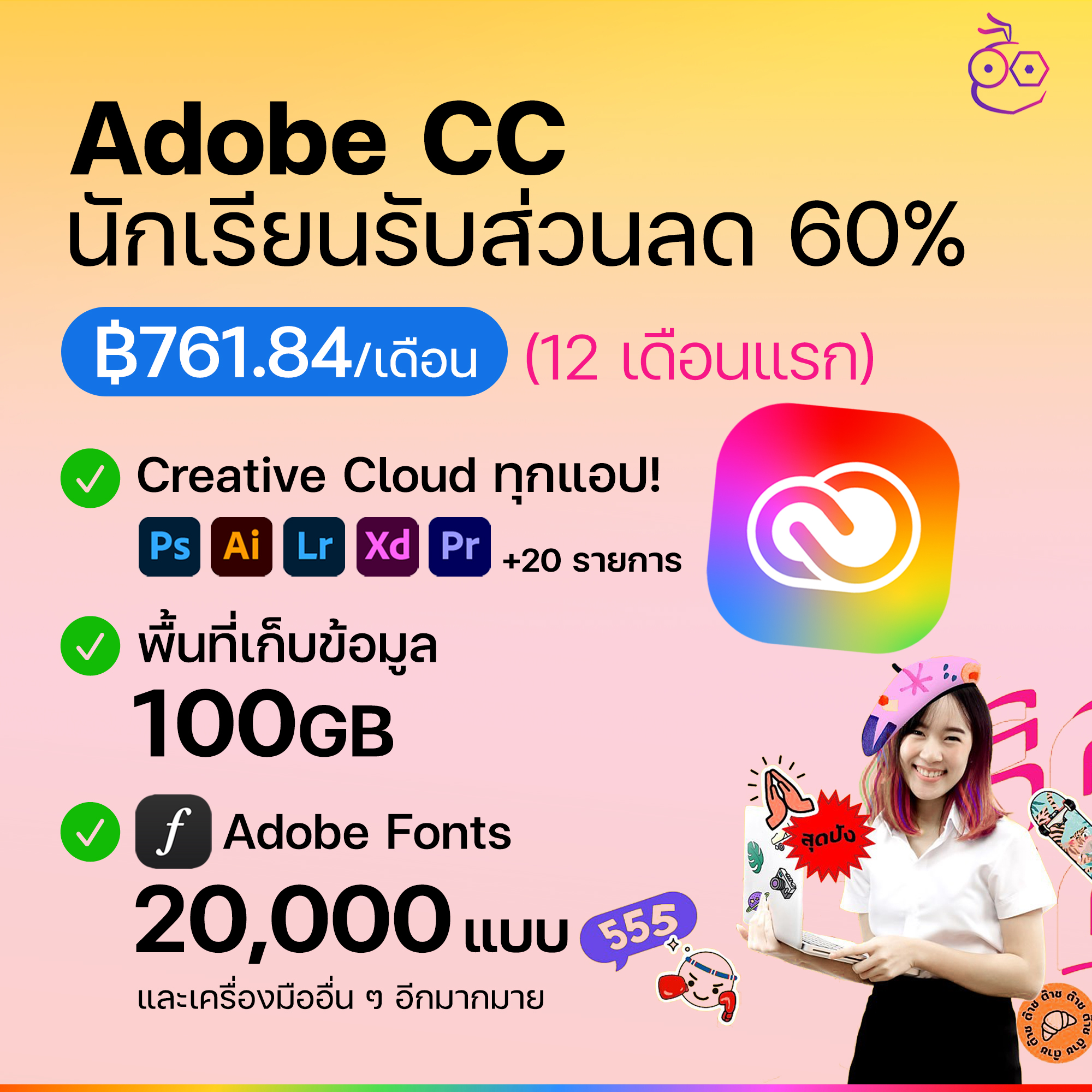 โปรโมชันสำหรับนักเรียน นักศึกษา สุดคุ้ม ซื้อ Creative Cloud All Apps 100GB รับส่วนลด 60% จ่าย เพียง 761.84 บาท/เดือน ใน 12 เดือนแรก (ปกติ 2,020.16 บาท/เดือน)