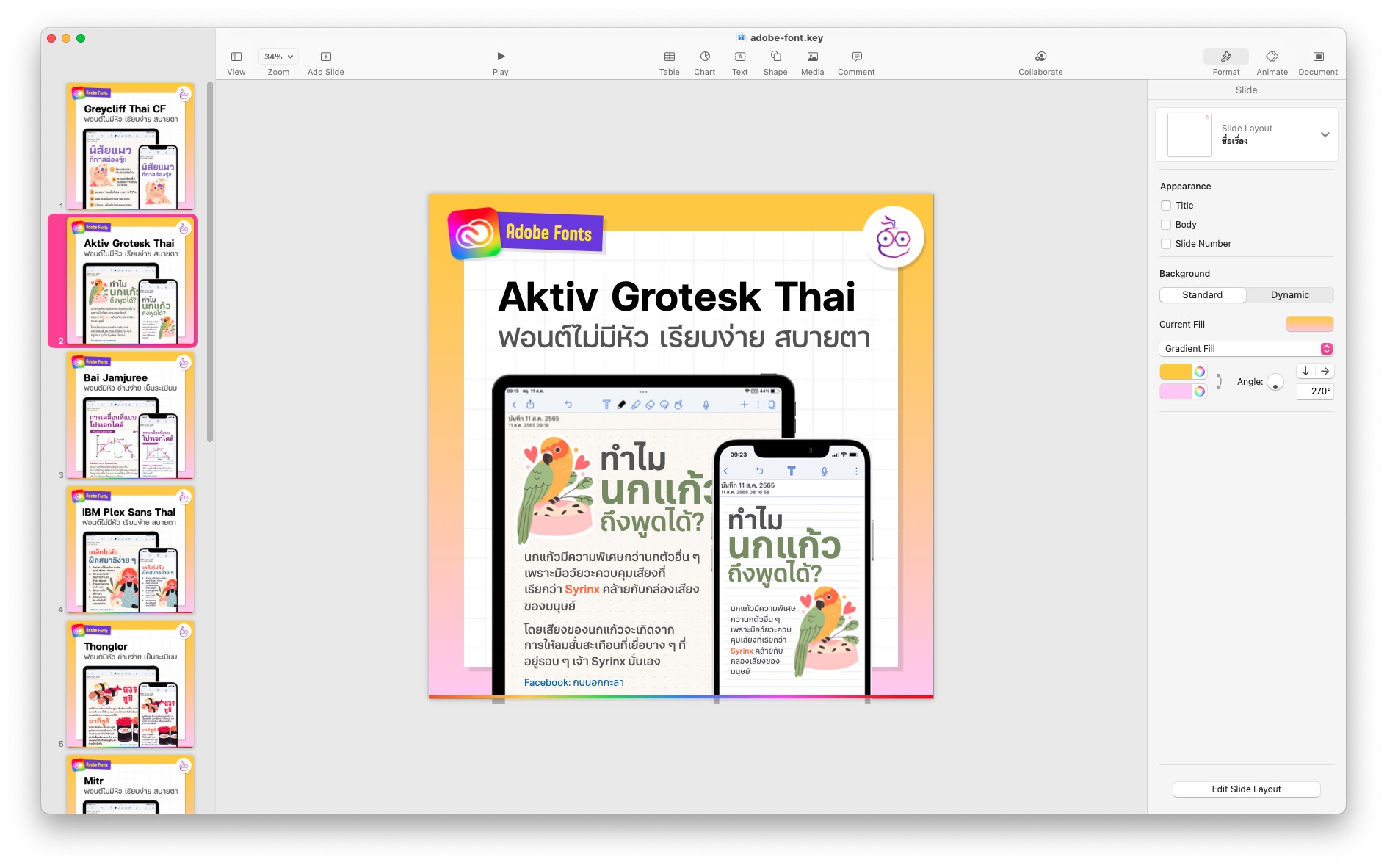 แต่หลายอาจจะสงสัยว่าฟอนต์เหล่านี้ใช้ได้เฉพาะโปรแกรมหรือแอปของ Adobe หรือไม่ ทีมงานได้ลองติดตั้งและลองใช้งานแอป Keynote, Pags, Number บน Mac และแอป Notability, Keynote, GoodNotes บน iPhone แล้ว พบว่า ฟอนต์ Adobe ที่เราติดตั้งมานั้น สามารถใช้งานในแอปเหล่านี้ได้ ถือว่าดีเลยทีเดียว!