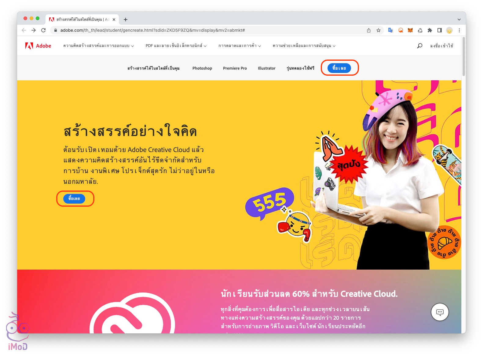 ไปที่เว็บไซต์ https://www.adobe.com/th_th/lead/student/gencreate.html?sdid=ZKD5F9ZQ&mv=display&mv2=abmkt แล้วคลิก “ซื้อเลย”