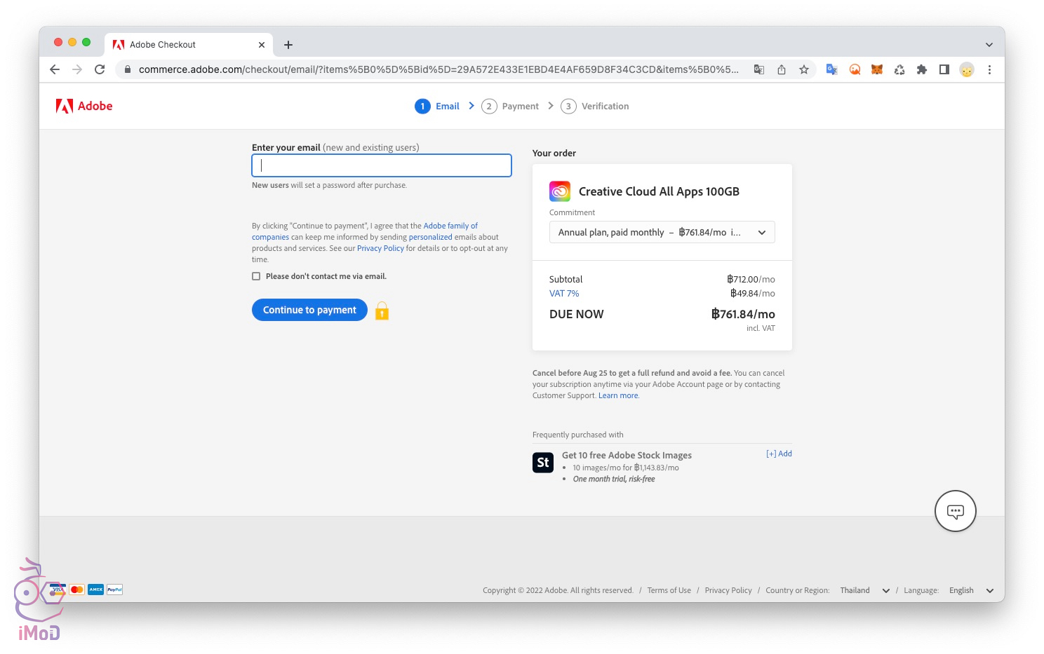 กรอกอีเมลให้เรียบร้อย และกดปุ่ม Continue to payment ในช่วงนี้มีโปรโมชันสำหรับนักเรียนรับส่วนลด 60% โดยซื้อ Creative Cloud All Apps 100GB ในราคาเพียง 761.84 บาท/เดือน ในปีแรก (จากปกติ 2,020.16 บาท/เดือน)