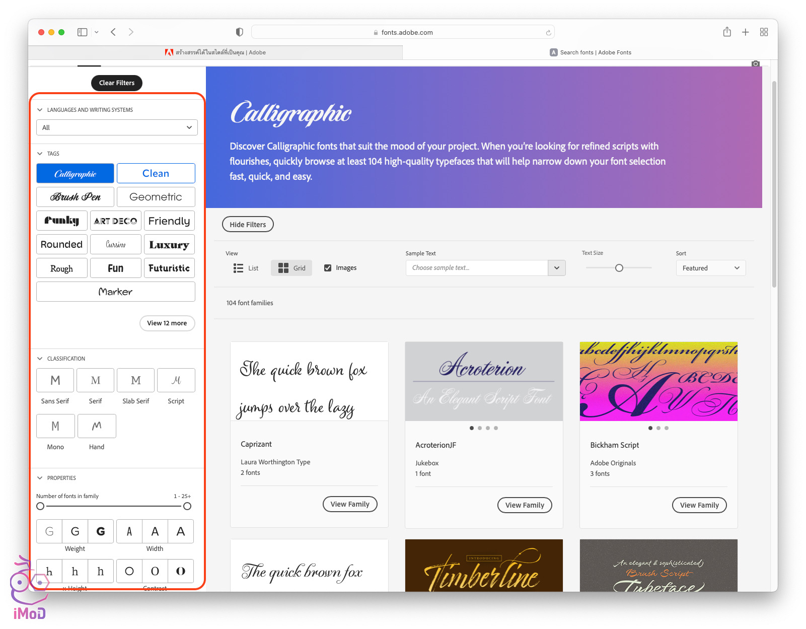 นอกจากนี้ เรายังสามารถเลือกดูฟอนต์อื่น ๆ ได้อีกด้วย โดยใช้ตัวกรองด้านซ้าย เพื่อหารูปแบบฟอนต์ที่ต้องการ อย่างเช่น ฟอนต์แนว Calligraphic ที่เป็นตัวอักษรตัวเขียนมีลวดลายการลงน้ำหนักตัวอักษรที่สวยงาม สามารถนำไปตกแต่งผลงานได้