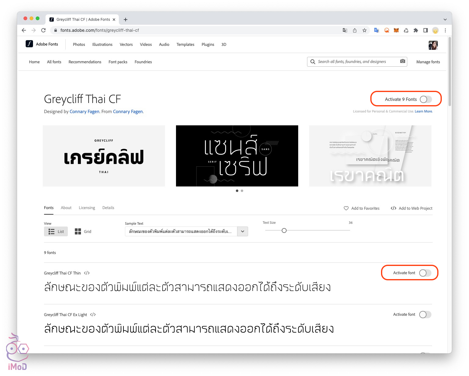ลิงก์จะเปิดเว็บไซต์ Adobe Fonts ให้เลือกฟอนต์ที่ต้องการหรือจะคลิกลิงก์จากฟอนต์ที่ทีมงานแนะนำด้านบนก็ได้ จากนั้นเลือก Activate Fonts โดยจะเลือก Activate ทั้งหมดด้านบน เพื่อเลือกติดตั้งทุกลักษณะ หรือเลือก Activate font ด้านล่าง เพื่อเลือกติดตั้งเฉพาะบางลักษณะที่ต้องการก็ได้