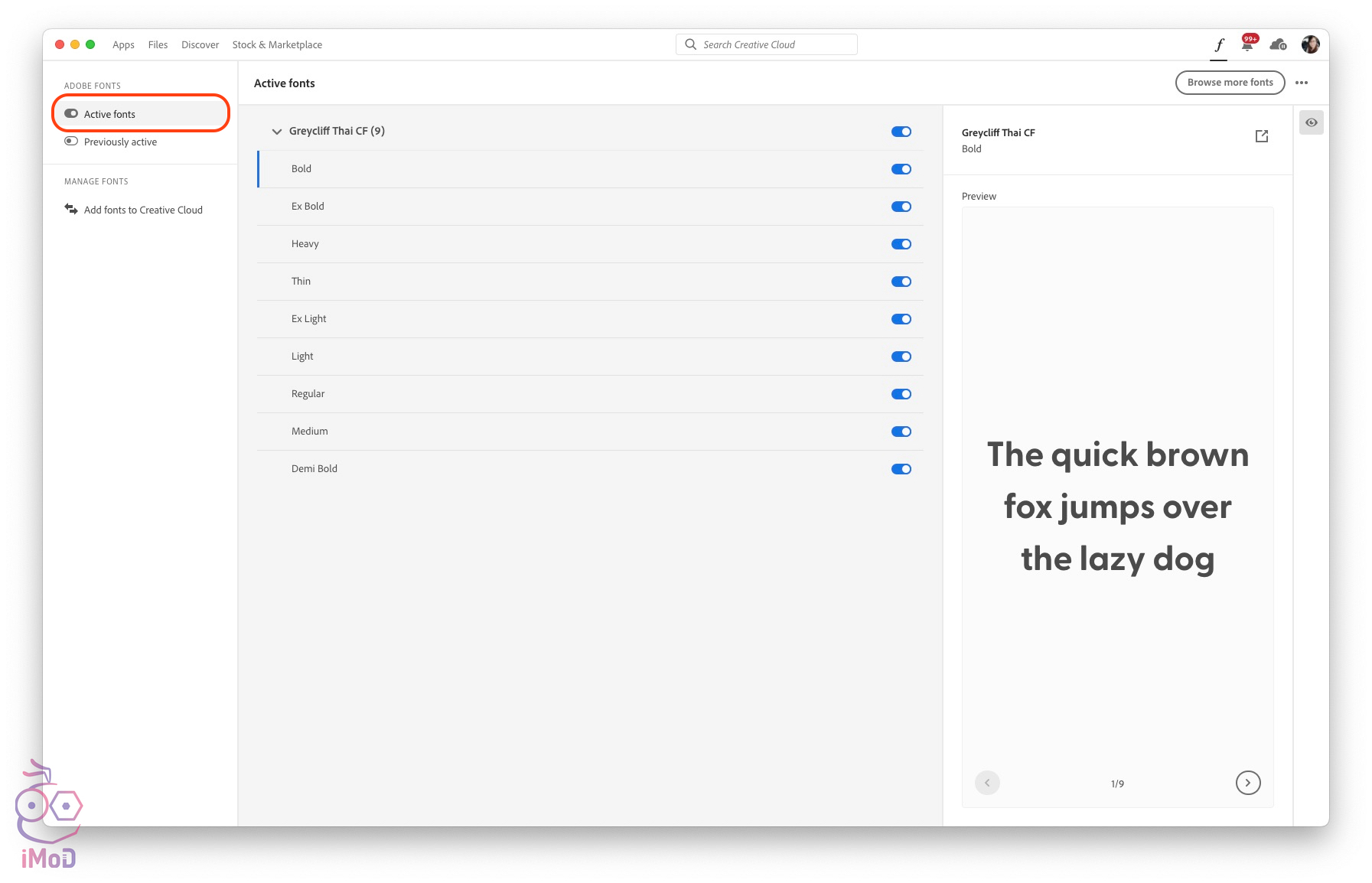 เมื่อ Activate ฟอนต์จากเว็บไซต์เรียบร้อยแล้ว ฟอนต์ก็จะถูกติดตั้ง เราสามารถจัดการฟอนต์ในแอป Adobe Creative Cloud ได้
