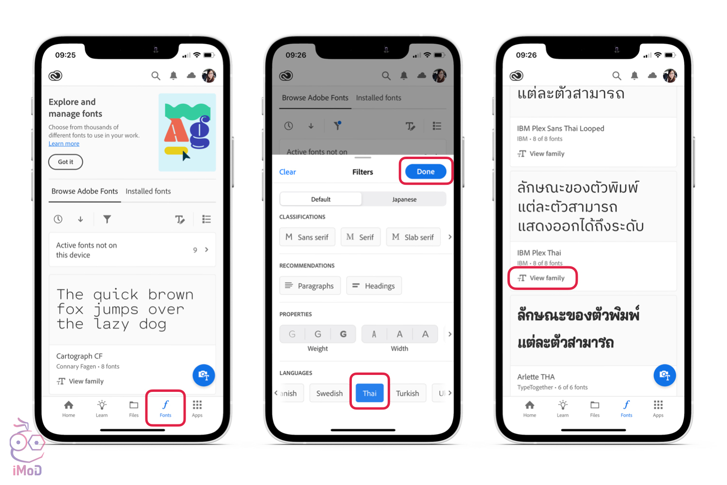 ไปที่แอป Adobe Creative Cloud บน iPhone, iPad พร้อมกับล็อกอินให้เรียบร้อย > เลือกตัวกรอง เพื่อค้นหาแบบฟอนต์ได้ง่ายมากขึ้น เมื่อเจอฟอนต์ที่ต้องการแล้ว ให้แตะ View family