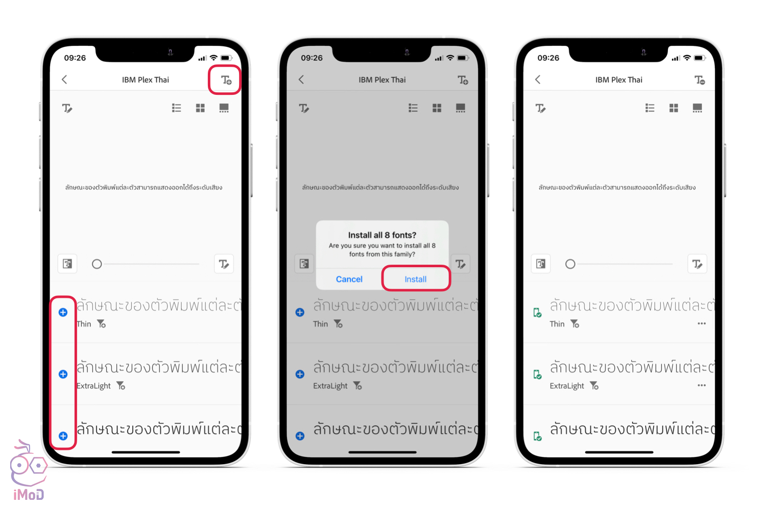 แตะไอคอน Activate font ด้านบนมุมขวา หรือถ้าหากต้องการบางลักษณะ ก็แตะไอคอนบวกด้านหน้าฟอนต์ได้เลย > แตะ Install > เราก็จะได้ฟอนต์มาใช้งานในเครื่อง