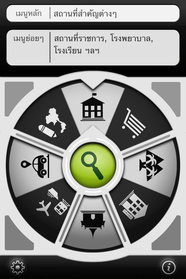 เมื่อเข้ามาแล้วจะเห็นวงกลมๆ ซึ่งสามารถหมุนเลือกประเภทของสถานที่ที่เราต้องการค้นหาได้ เช่น
