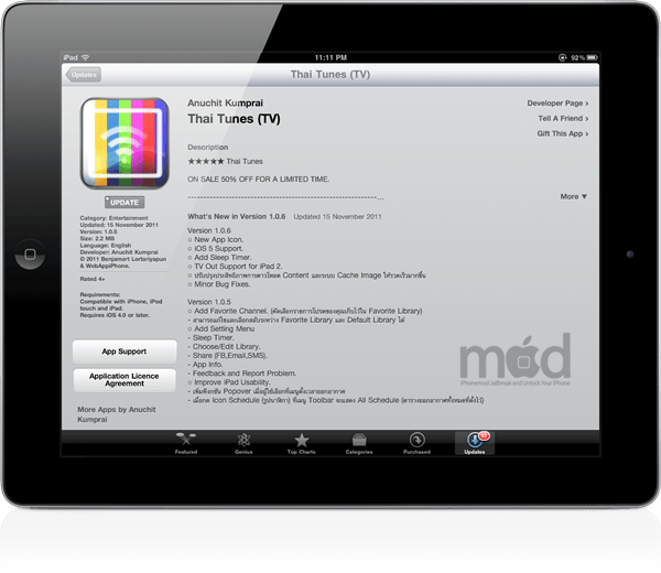 สำหรับท่านที่ชอบรับชมทีวีผ่าน iPhone, iPod Touch และ iPad ผมได้แนะนำไปค่อนข้างนานแล้วสำหรับ Thai Tunes ซึ่งต้องถือว่าแนะนำตั้งแต่ช่วงแรกๆของการพัฒนาเลยก็ว่าได้ตอนนี้จนมาถึงเวอร์ชัน Thai Tunes 1.0.6 แล้ว ตอนนี้มีการเปลี่ยนแปลงหลายๆอย่างที่ทำให้แอปฯน่าใช้งานมากยิ่งขึ้น