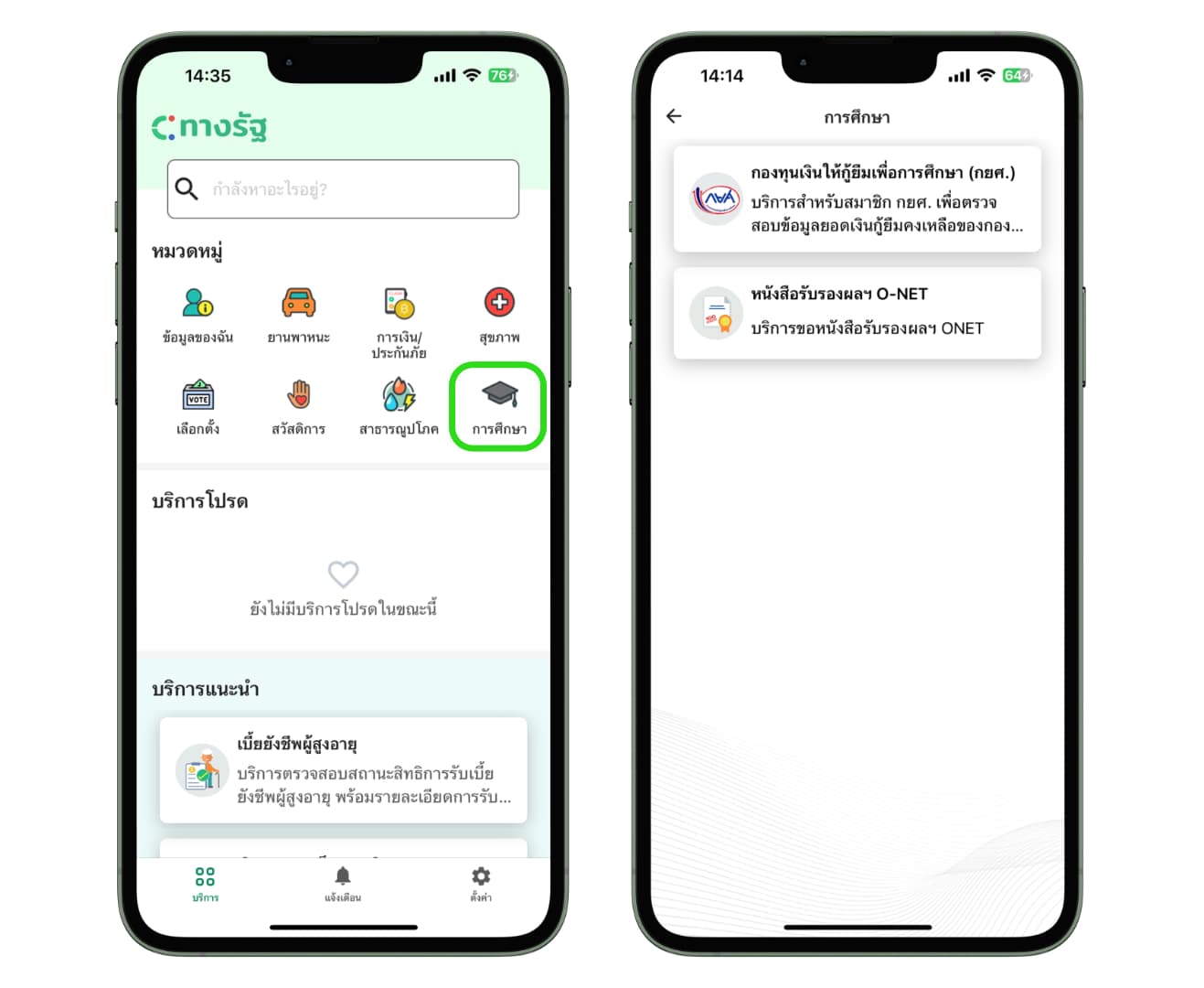 สำหรับเมนูการศึกษา น้อง ๆ สามารถเข้ามาตรวจสอบข้อมูลและยอดกู้คงเหลือของ กยศ. ได้ พร้อมทั้งดูคะแนน O-NET ได้ด้วย