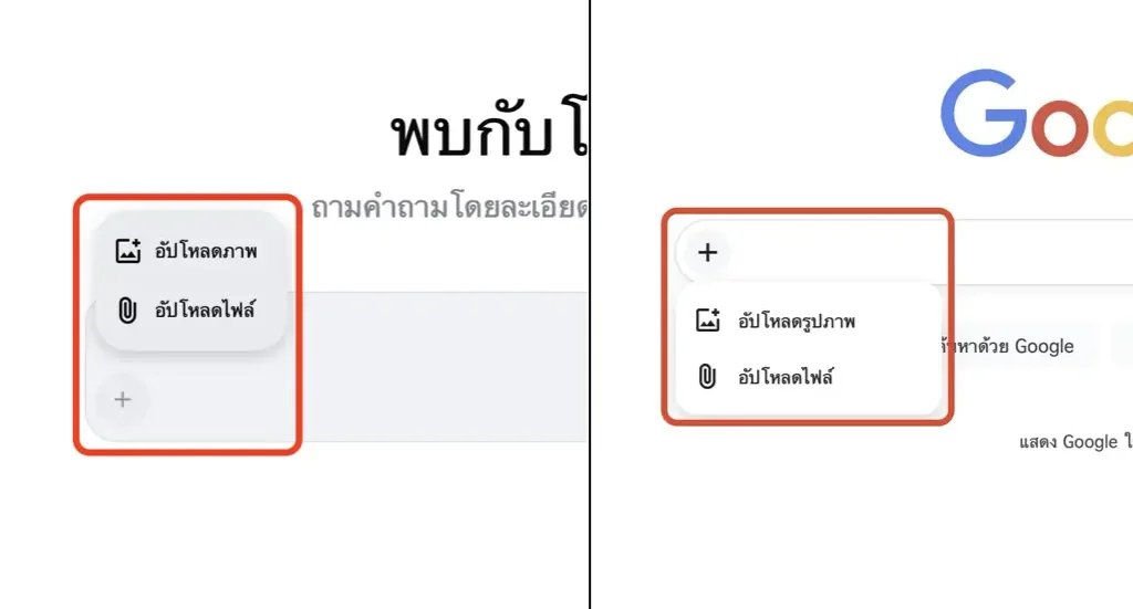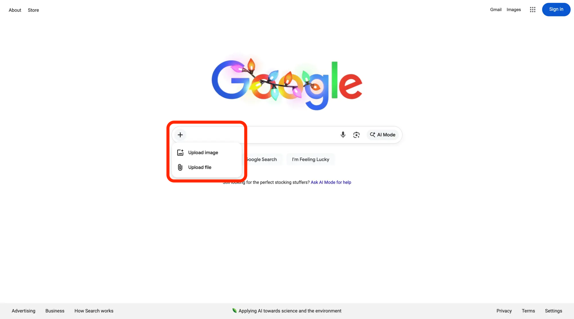 ตอนนี้หน้าแรกของ Google.com แถบค้นหามีไอคอนรูปเครื่องหมายบวก (+) ทางด้านซ้ายสุด แทนที่ไอคอนแว่นขยายบบเดิม ผู้ใช้สามารถคลิกที่ปุ่มนี้เพื่อเลือก “Upload image” อัปโหลดรูปภาพ หรือ “Upload file” อัปโหลดไฟล์ ได้ เหมือนหน้าช่องกรอกของข้อความ AI Mode