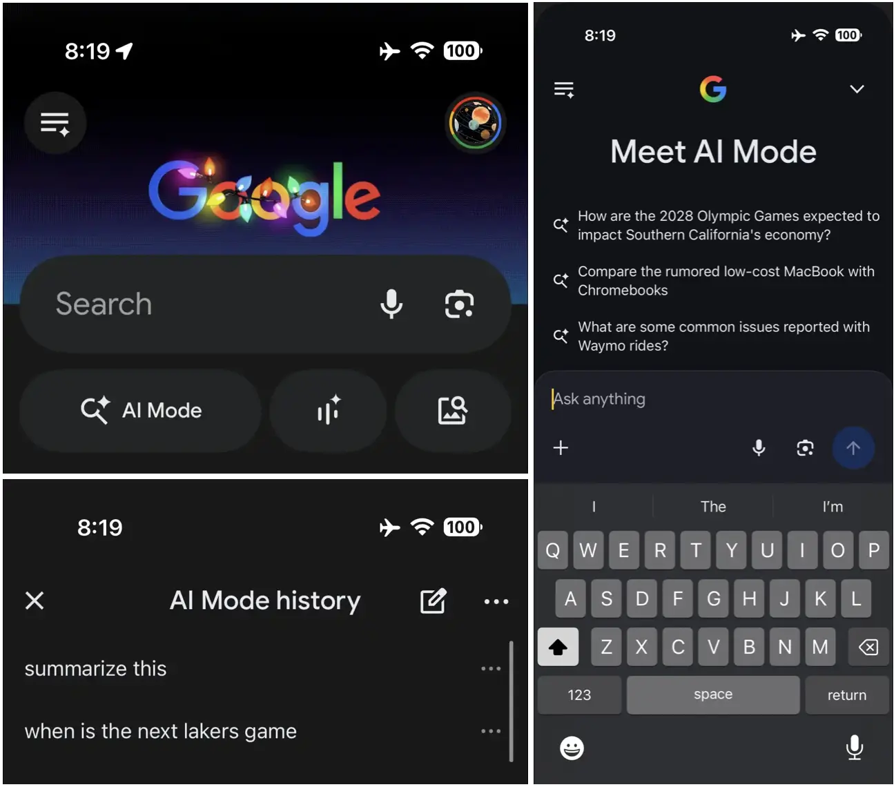 ในขณะเดียวกัน แอป Google บนระบบ iOS ได้เปลี่ยนไอคอนขวดทดลองของ Google Labs ที่มุมซ้ายบนของแท็บ Home ให้เป็นปุ่มที่เปิดดูประวัติการใช้งาน AI Mode แทน ซึ่งถือว่าสะดวกมากขึ้น ปัจจุบันยังไม่มีฟีเจอร์นี้บน Android
