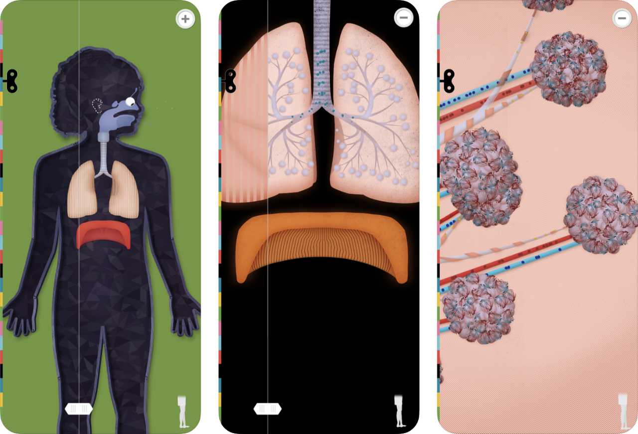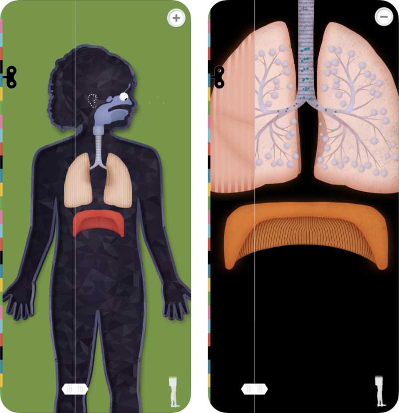 ซึ่งข้อดีของแอป The Human Body ก็คือ “อวัยวะแต่ละส่วนนั้นสามารถเคลื่อนไหวได้แบบอินเตอร์แอคทีฟเสมือนจริง” จึงทำให้เราสามารถเรียนรู้และทำความเข้าใจระบบการทำงานของอวัยวะส่วนนั้นได้ง่ายขึ้นเป็นอย่างมาก เช่น เมื่อเราแตะไปที่ ‘ระบบทางเดินหายใจ’ ก็จะเห็น การทำงานของปอด (พอง-ยุบ) พร้อมการหายใจนำออกซิเจนเข้าและปล่อยคาร์บอนไดออกไซด์ออกมา เป็นต้น