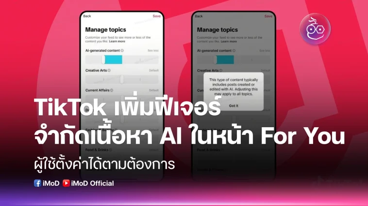TikTok เปิดตัวฟีเจอร์ใหม่ ที่ให้ผู้ใช้สามารถจำกัดปริมาณเนื้อหาที่สร้างด้วย AI (AI-generated content) ที่แสดงในหน้า For You ของผู้ใช้ได้ผ่านการตั้งค่าในหน้า Manage Topics ซึ่งจะมีตัวเลื่อ (Slider) เพื่อปรับระดับเนื้อหา AI ที่ต้องการรับชม