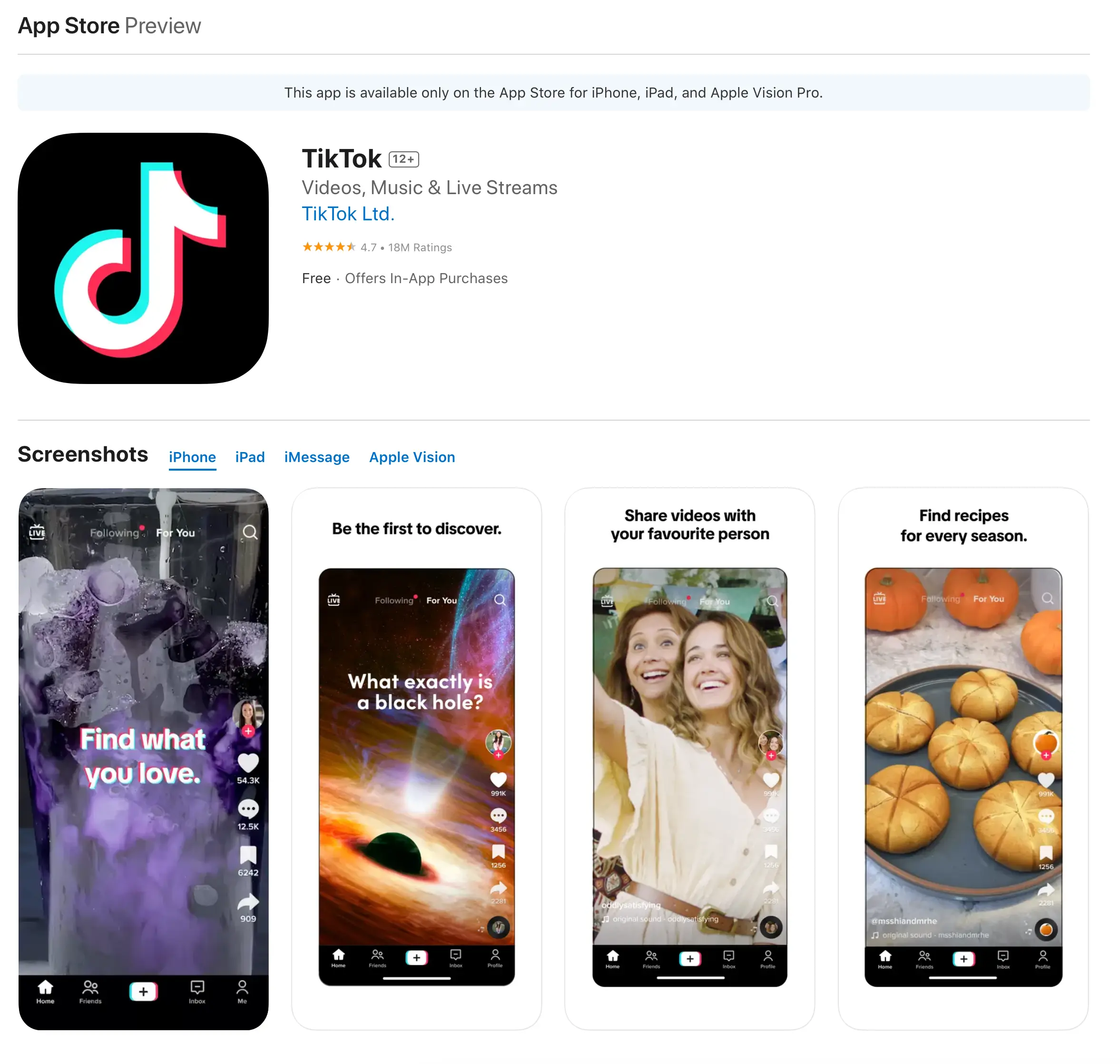 TikTok ถูกแบนใน App Store นานเกือบเดือน แต่ผู้ใช้ ยังสามารถเข้าใช้งานได้ตามปกติ แต่ถ้าจะดาวน์โหลดหรืออัปเดตแอป จะไม่สามารถทำได้ แต่ ณ ตอนนี้ (14 ก.พ. 2025) แอป TikTok กลับมาให้ดาวน์โหลดใน App Store สหรัฐฯ ได้แล้ว