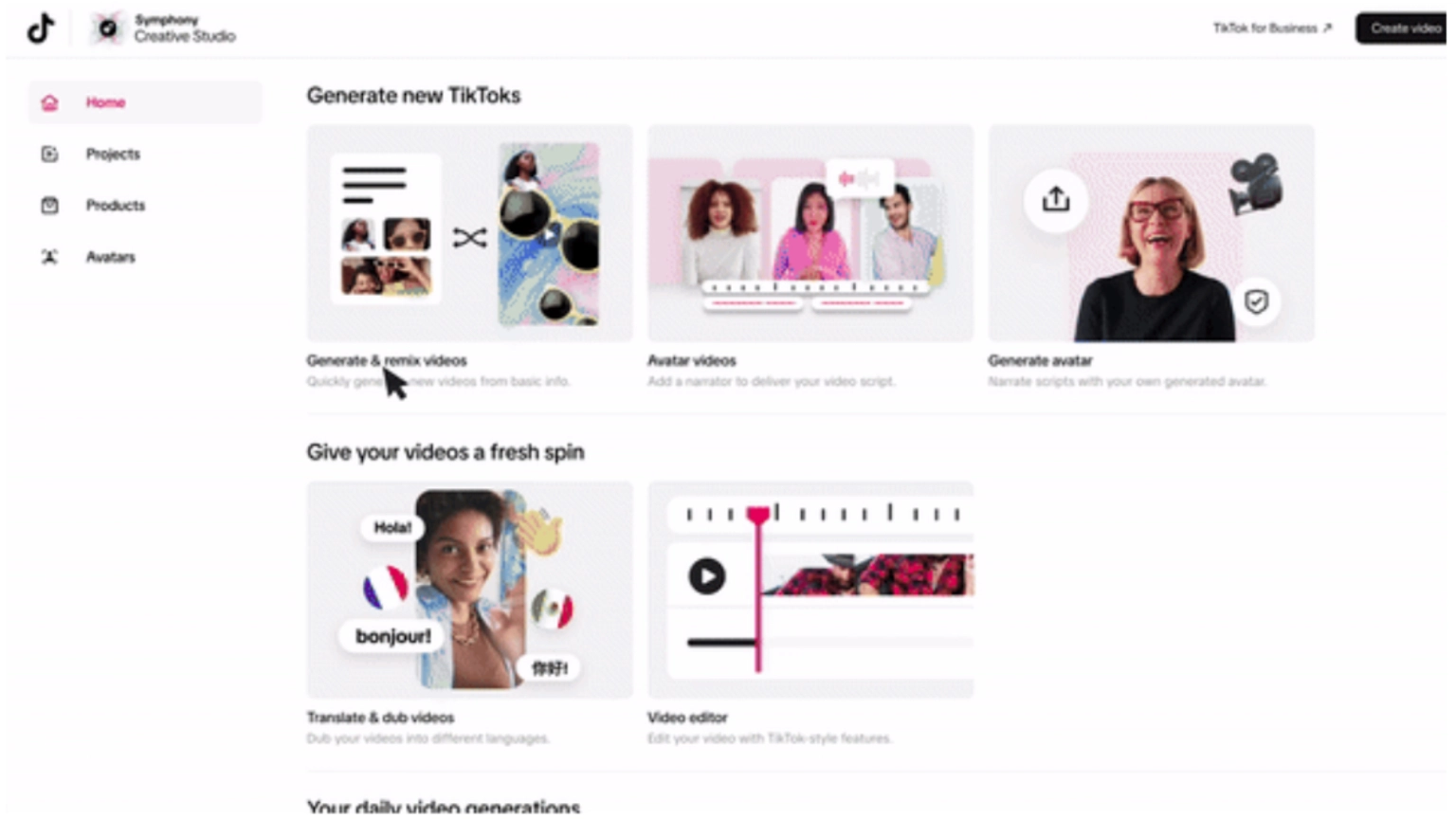 การผสานรวมนี้จะพร้อมใช้งานผ่าน Symphony Creative Studio ของ TikTok ซึ่งเป็นเครื่องมือสร้างวิดีโอที่ขับเคลื่อนด้วย AI ซึ่งเปิดตัวในวันนี้สำหรับผู้ลงโฆษณาทุกคน เครื่องมือนี้สามารถสร้างวิดีโอตามคำอธิบายผลิตภัณฑ์ เพิ่มอวตาร AI เพื่อ “พูด” เกี่ยวกับมัน และแม้แต่รวมการพากย์เสียงที่ขับเคลื่อนด้วย AI ในภาษาต่างๆ ผู้ลงโฆษณาสามารถใช้เครื่องมือนี้เพื่อสร้างหลายเวอร์ชันของโฆษณา รวมทั้ง “รีมิกซ์” โฆษณาที่มีอยู่