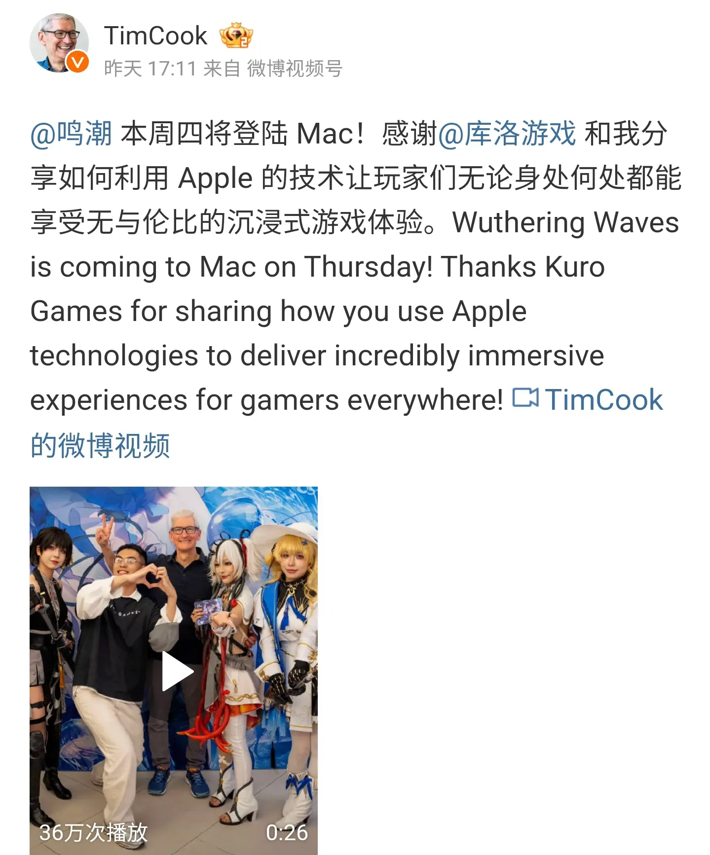 ในงานอีเวนต์ของ Kuro Games ที่ปักกิ่งครั้งล่าสุด Tim Cook ซึ่งเป็น CEO ของ Apple ได้ปรากฏตัวในงานเปิดตัวและสาธิตการใช้งานอุปกรณ์ Mac ของ Wuthering Waves เวอร์ชั่น 2.2